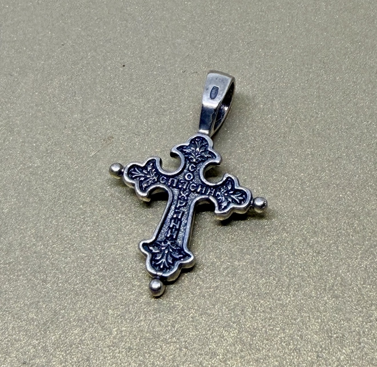 На обороте — короткая молитва, обращенная к Господу, которая традиционно помещается на нательных крестах:«Спаси и сохрани».