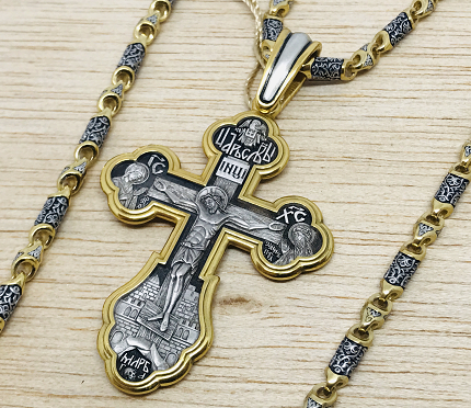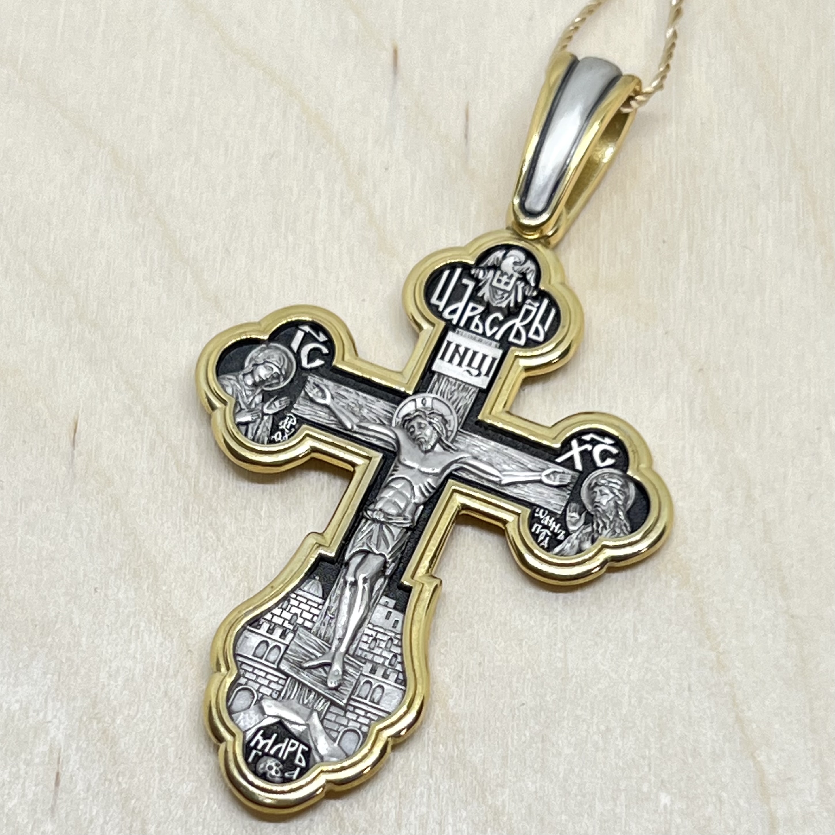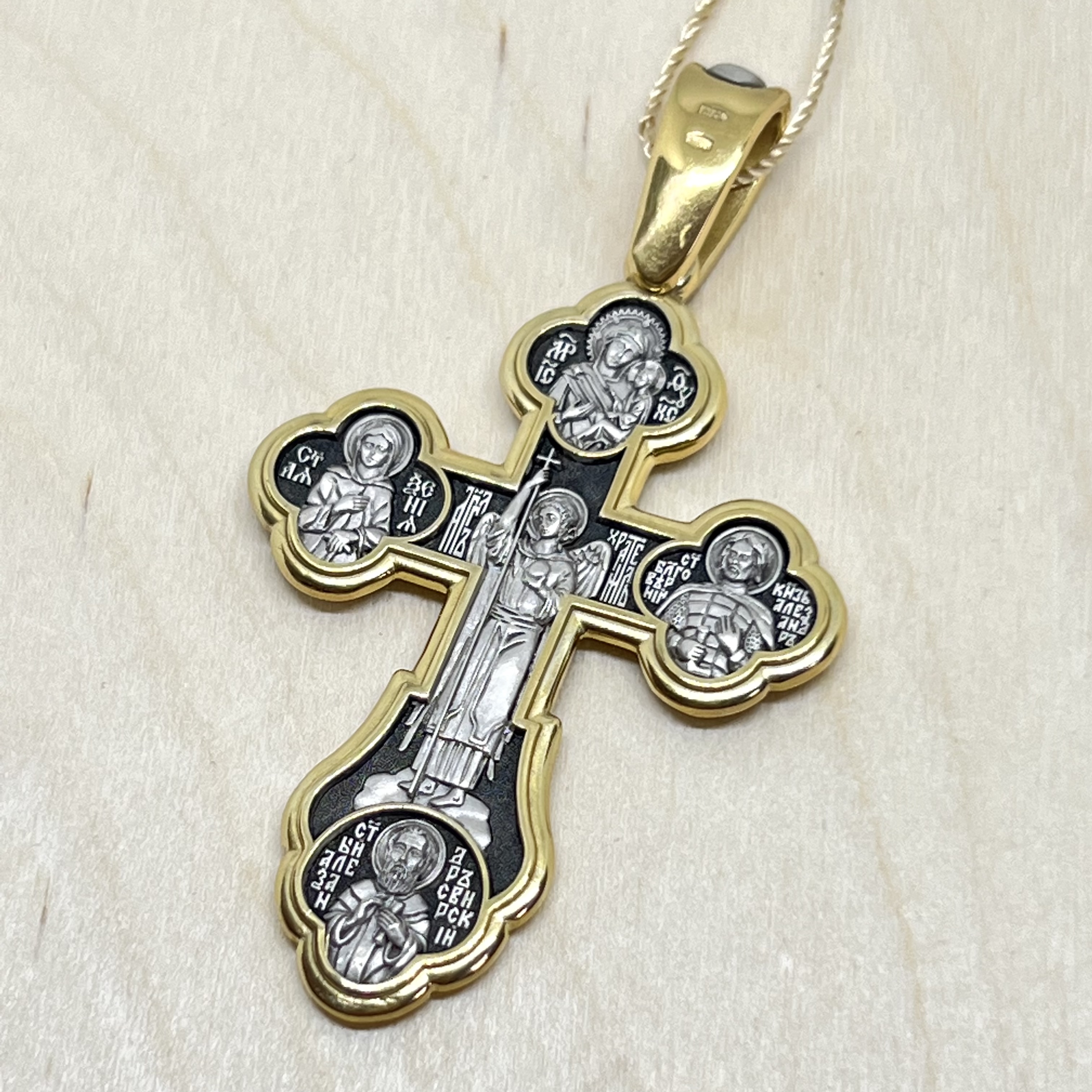 На лицевой стороне креста изображено Распятие Господа нашего Иисуса Христа. С двух сторон Ему предстоят в деисусе (молении за людей) Пресвятая Богородица и пророк Иоанн Предтеча, Креститель Господень. На оборотной стороне в центре изображён Ангел-Хранитель. Это Ангел, который дается каждому человеку в Крещении для попечения и защиты его души. Слева изображена святая блаженная Ксения Петербургская, которая почитается как скорая помощница в устроении семейного счастья, помогает при болезнях детей и близких. Справа – святой благоверный князь Александр Невский. Святой почитается как защитник православных христиан и покровитель воинов. Внизу изображён святой преподобный Александр Свирский – один из величайших русских святых, удостоенный явления Святой Троицы. Святой помогает бездетным супругам, исцеляет самые разные недуги. Венчает образ Тихвинская икона Божией Матери.