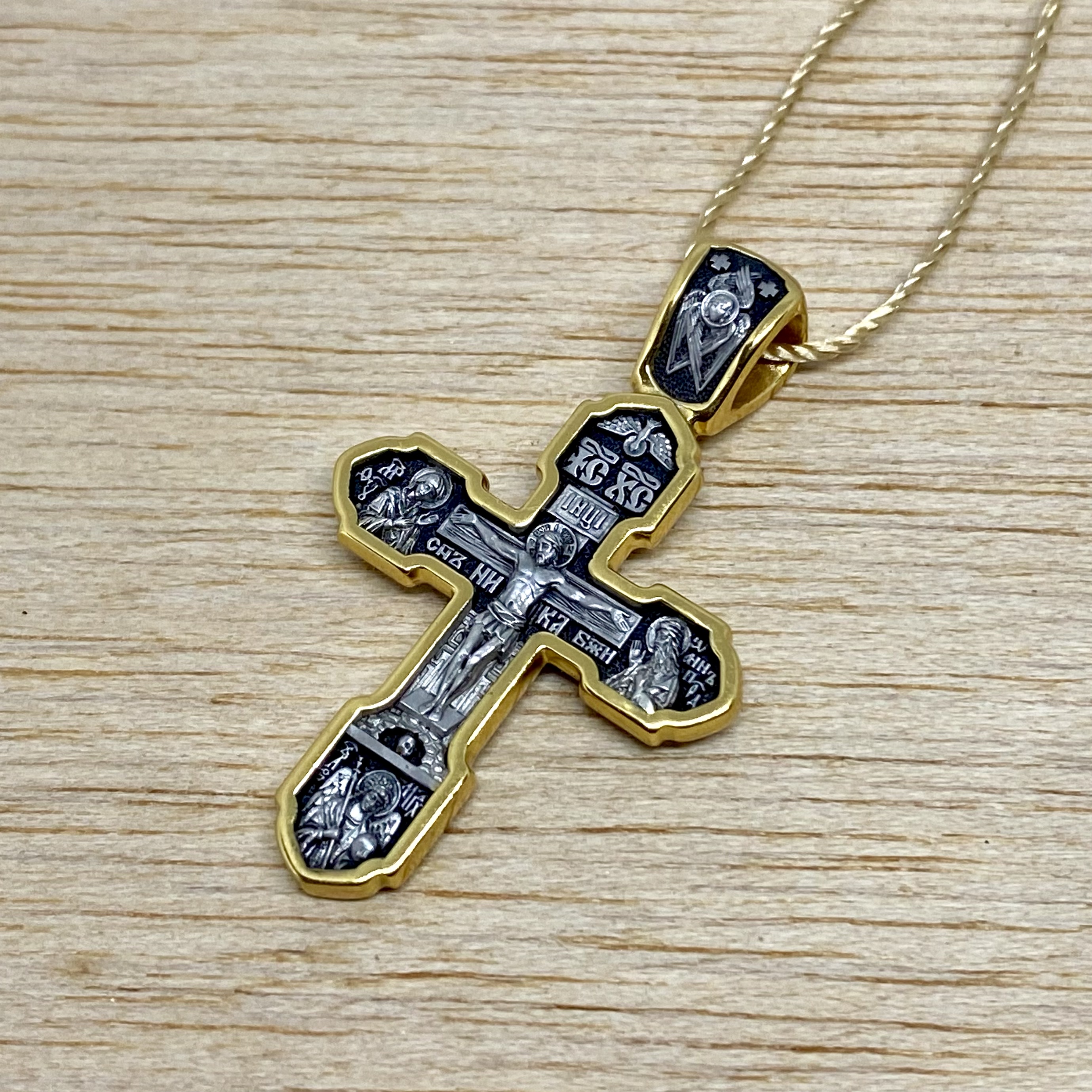 На лицевой стороне изображено Распятие Господа Иисуса Христа. С двух сторон Христу предстоят Пресвятая Богородица и Иоанн Креститель, главные молитвенники за людей перед Богом. Такая композиция называется «Деисус», что значит «моление». Внизу –икона Архангела Михаила, могучего защитника от злых сил. На обороте в центре – Ангел-Хранитель, рядом с которым помещены образы особо почитаемых в Церкви святых, мощи. Это св. блаженная Ксения Петербургская, св. блгв. кн. Александр Невский, и великий святой целитель и чудотворец прп. Александр Свирский. Вверху креста – Казанская икона Пресвятой Богородицы.