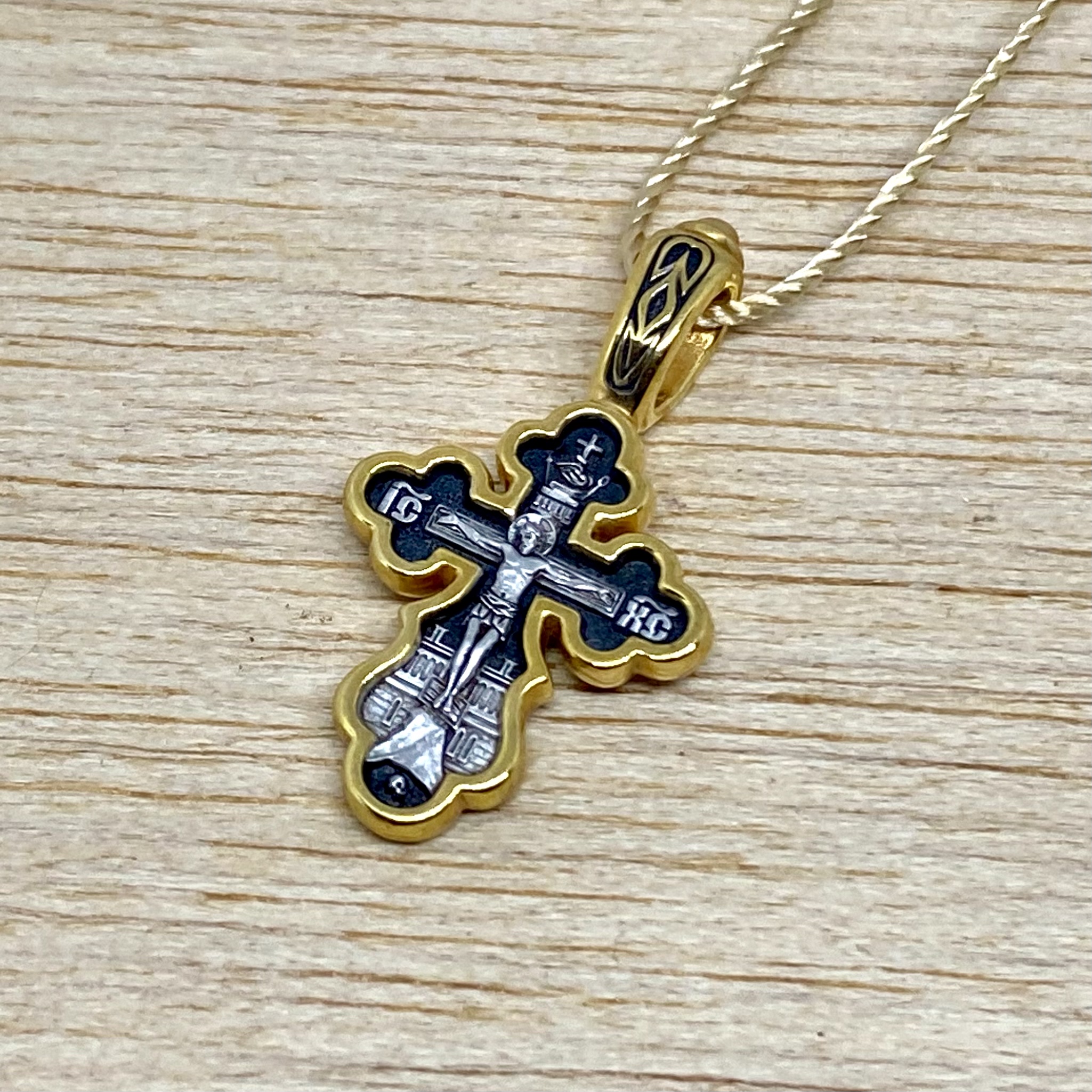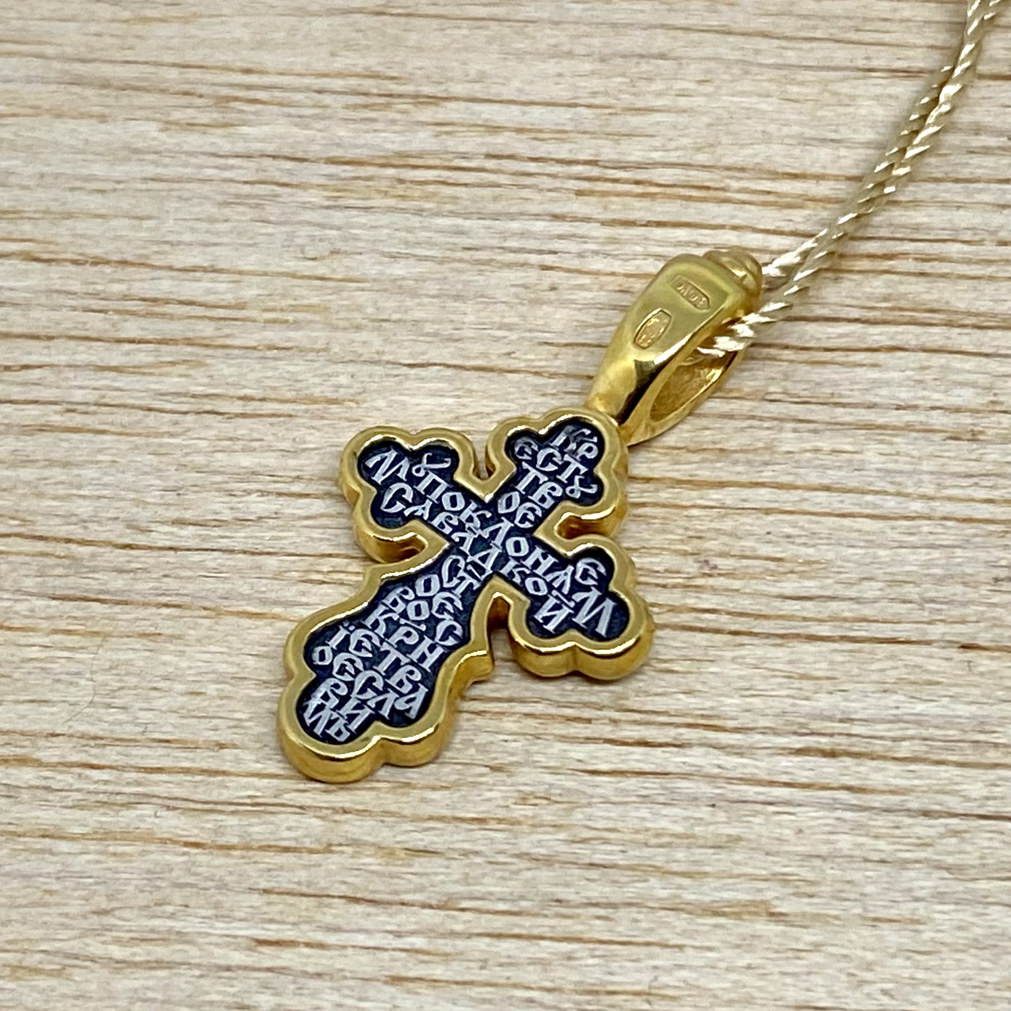 На лицевой стороне креста изображено Распятие Господа Иисуса Христа. На обороте написан тропарь Животворящему Кресту: