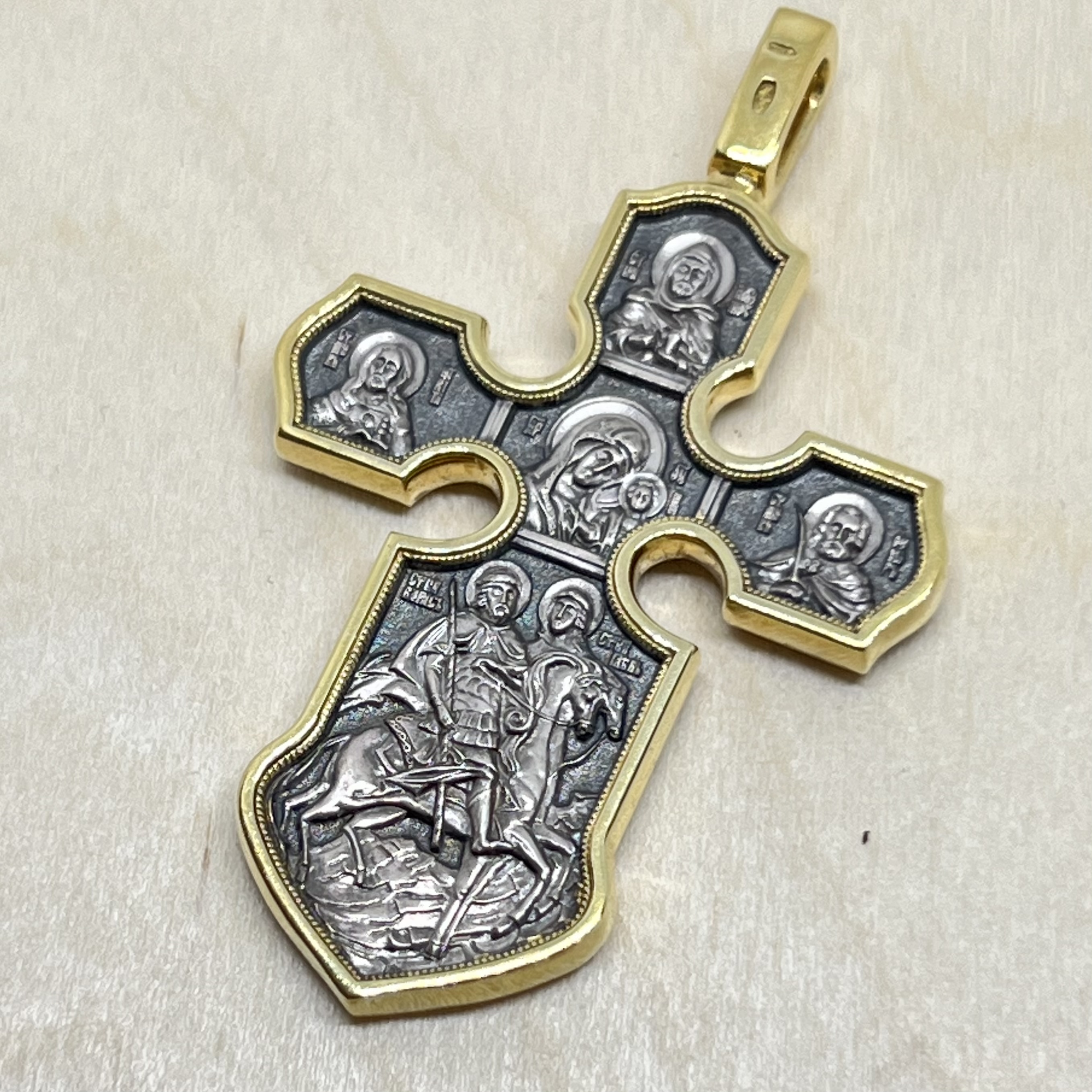 Большой нательный крест, по форме напоминающий якорь (древнейший образ креста, символ надежды и спасения), украшают иконы Христа, Богородицы и святых, прославившихся своей борьбой с нечистой силой, колдунами, иноверцами и со всяким злом вообще.