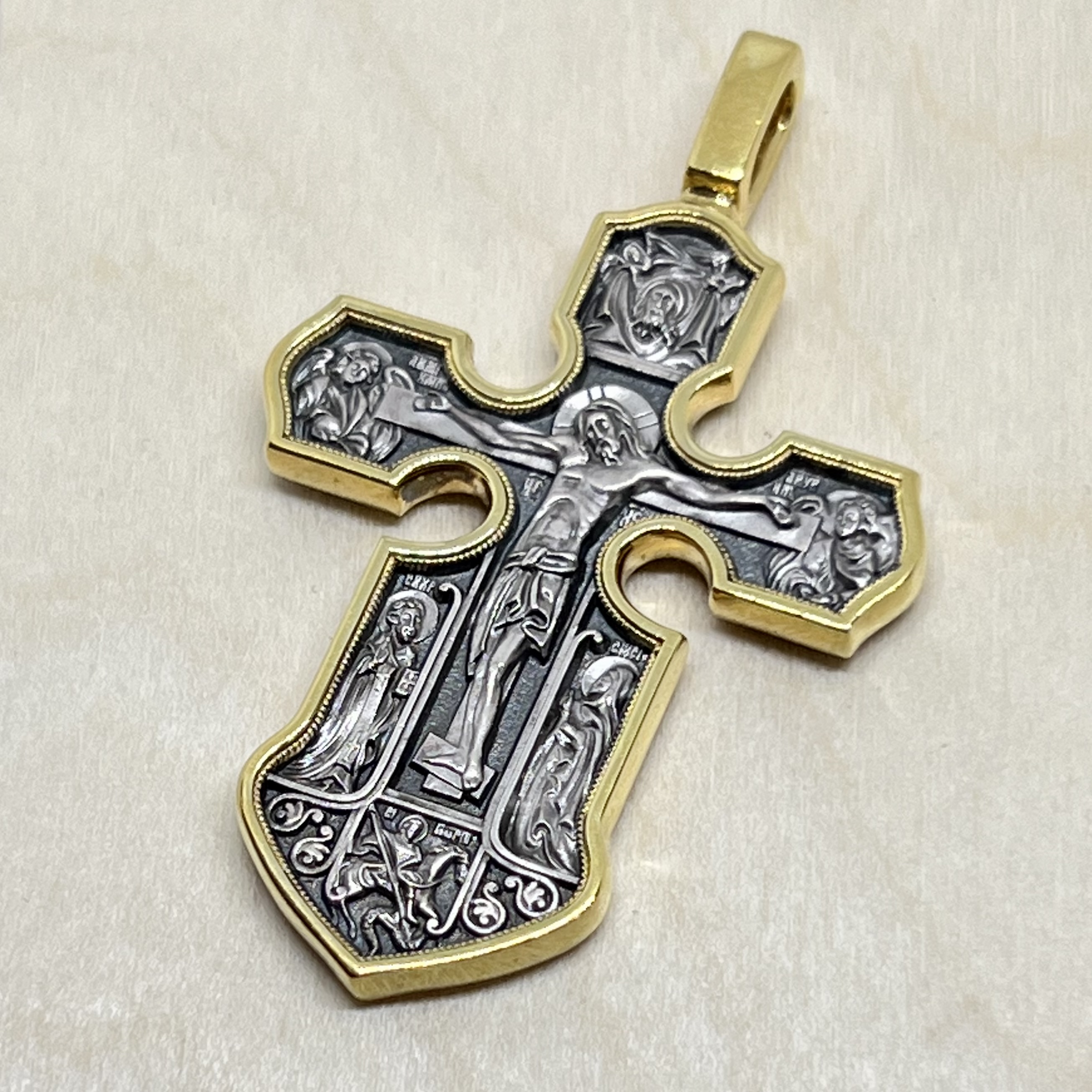 На лицевой стороне рядом с Распятым Спасителем стоят святые мученики Киприан и Иустина. Господь даровал святым благодать помогать людям в борьбе с дьяволом. Рядом с простертыми руками Распятого Христа предстоят святые архангелы Михаил (слева) и Уриил, которым дана власть помогать людям в борьбе с духами злобы. Они укрепляют в нас святую веру, просвещают ум светом Евангелия. Архистратиг Михаил изображается с мечом в руке. Он - военачальник ангельского войска, низринувший с Небес восставшего на Бога Денницу. У архангела Уриила в руке огонь. Он несет в мир Божий свет и властвует над небесными светилами.