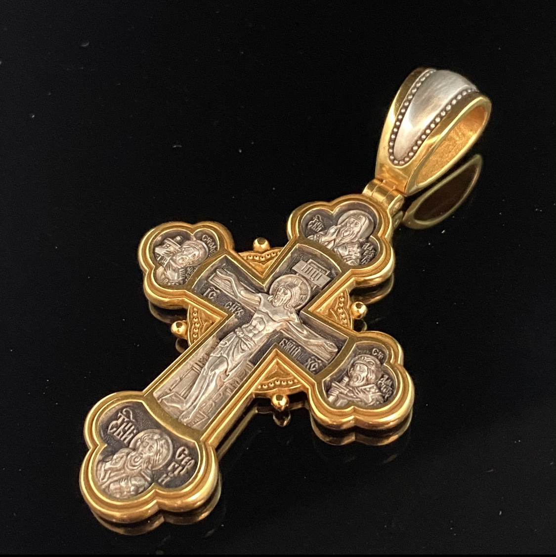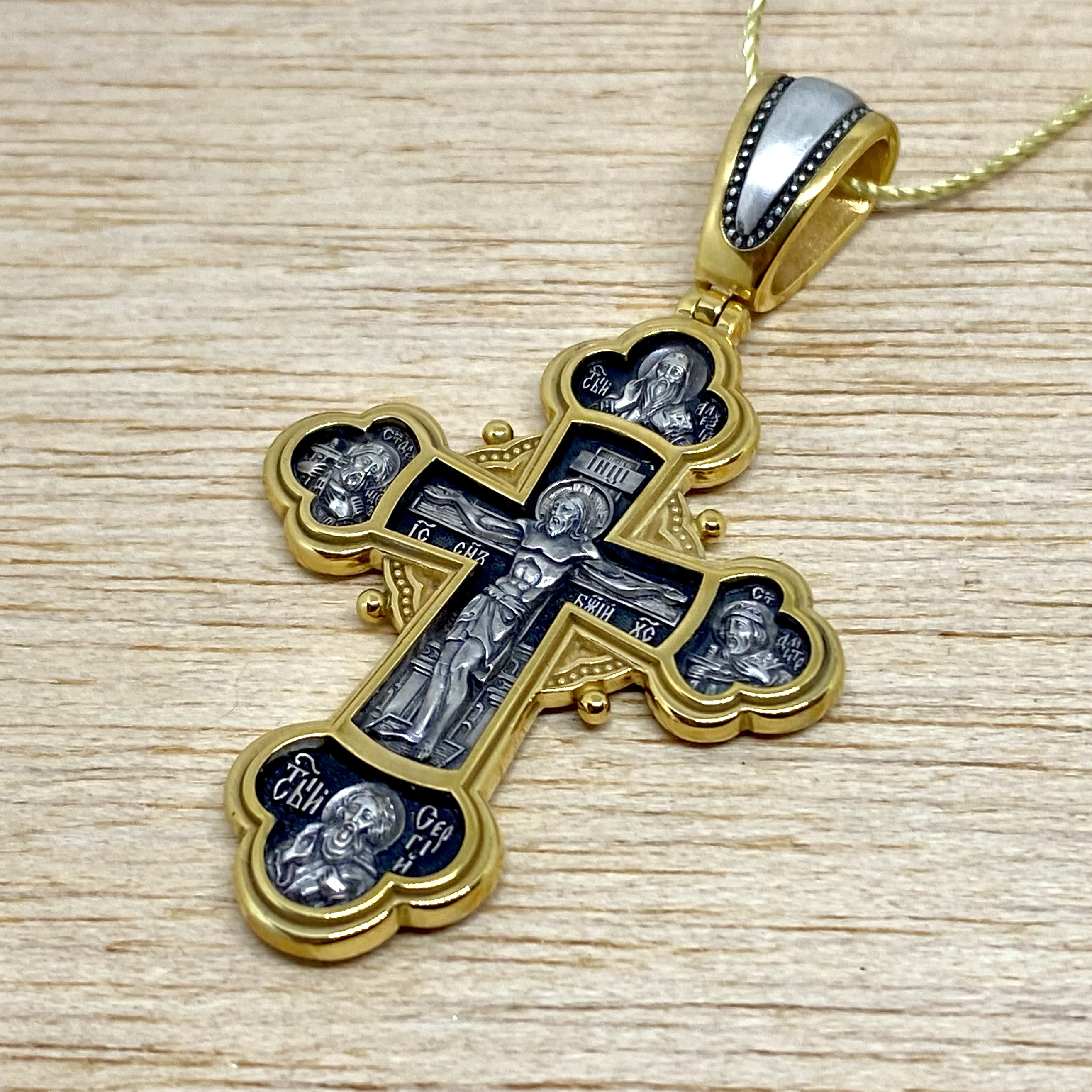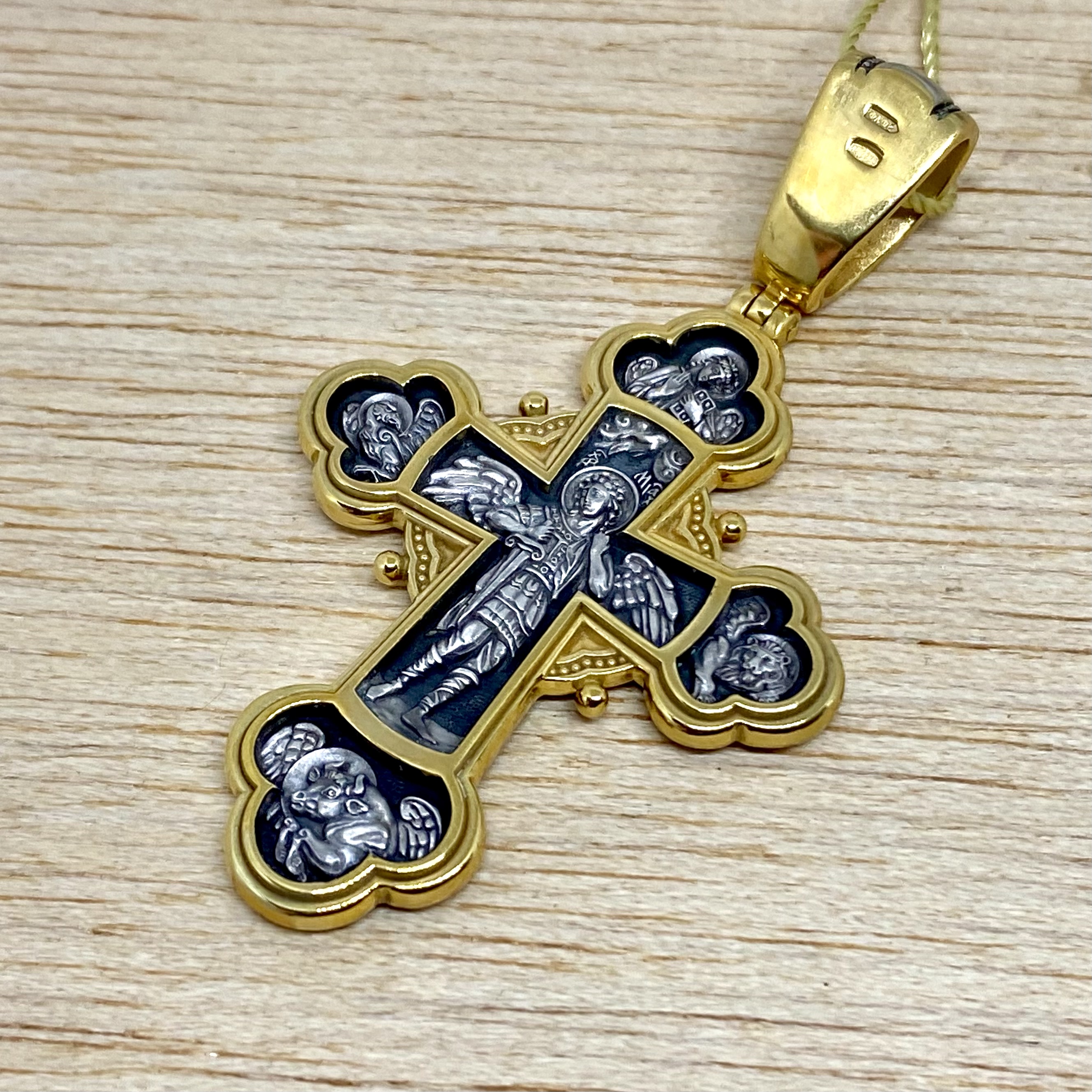 На лицевой стороне креста в центре по традиции находится Распятие Господа Иисуса Христа. Слева от Господа изображен святой благоверный князь Александр Невский, справа святой благоверный князь Димитрий Донской. Святые князья почитаются как покровители воинов и защитники от врагов телесных и душевных. Вверху над Распятием образ митрополита московского святителя Алексия. Он почитается как помощник в воспитании детей и целитель, особенно при болезни глаз. Внизу - икона преподобного Сергия Радонежского, великого чудотворца и целителя. К нему обращаются в различных болезнях, тяжелых жизненных ситуациях, а также когда у детей возникают сложности в обучении. На обратной стороне креста изображен Архистратиг Михаил. Могучий Архангел почитается как покровитель воинов и всех верных Богу и ведущих борьбу против сил зла, а также защитник душ умерших, страж райских врат. Над ним благословляющая десница- знак присутствия Бога. Вокруг символы четырех евангелистов: орел (Иоанн), лев (Марк), телец (Лука) и ангел (Матфей).