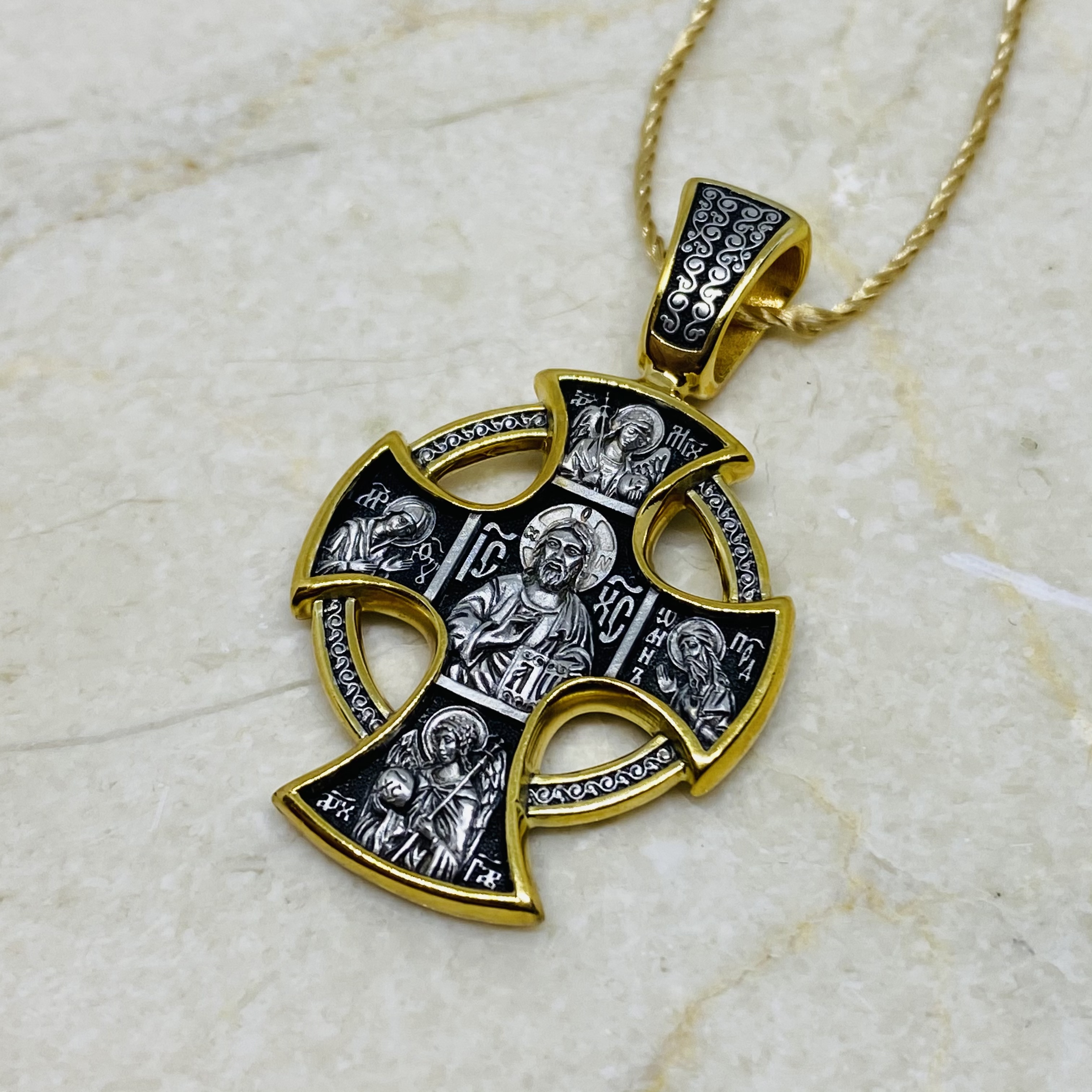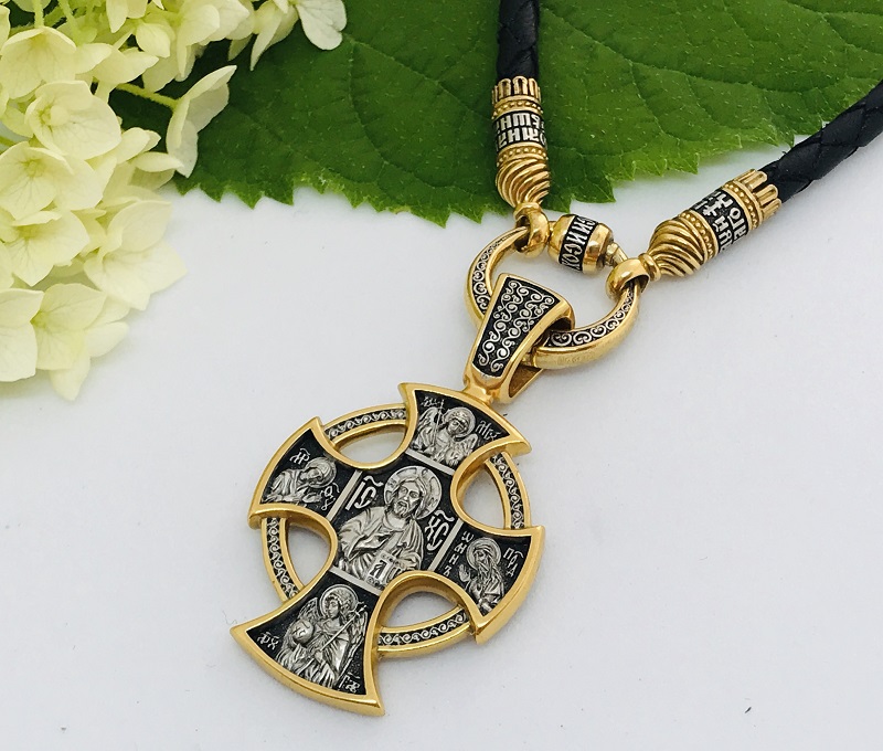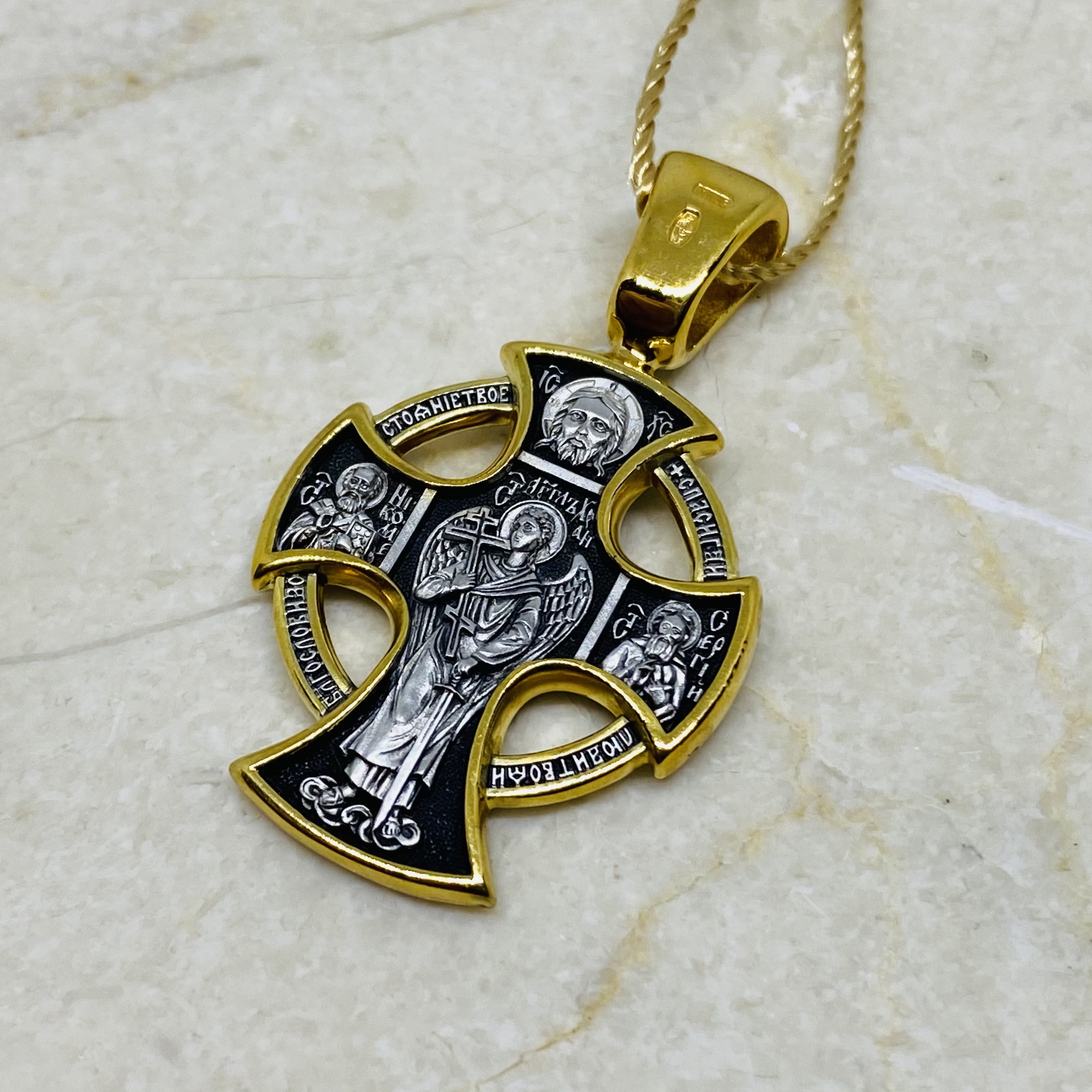 Вверху и внизу изображены архангелы Михаил и Гавриил. На обороте в центре — Ангел Хранитель, рядом с которым помещены иконы особо почитаемых в Русской Церкви святых.