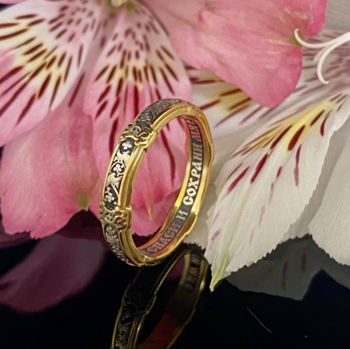 Орнамент на кольце, изображающий птиц, окруженных плетеным узором, расшифровывается как символ человеческих душ, попавших в мережи Церкви Христовой.