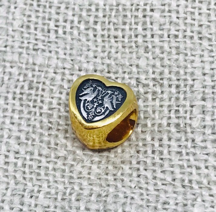 Сердце, форму которого имеет бусина, является символом любви. Любовь – это главная христианская добродетель и великая сила, которая может изменить мир. Пример такой любви подал нам Иисус Христос, приняв смерть на кресте. «Силою Креста Твоего сохрани нас, Господи», - написано на бусине.