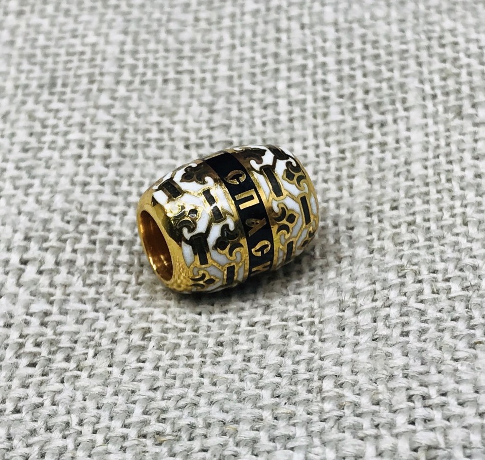 На бусине помещен самый распространенный в Византии орнамент, имеющий древнейшие восточные корни: пальметта «византийский цветок». Пальметта, с крестообразным ростком внутри, толкуется как сердце, процветшее любовью к Господу.