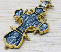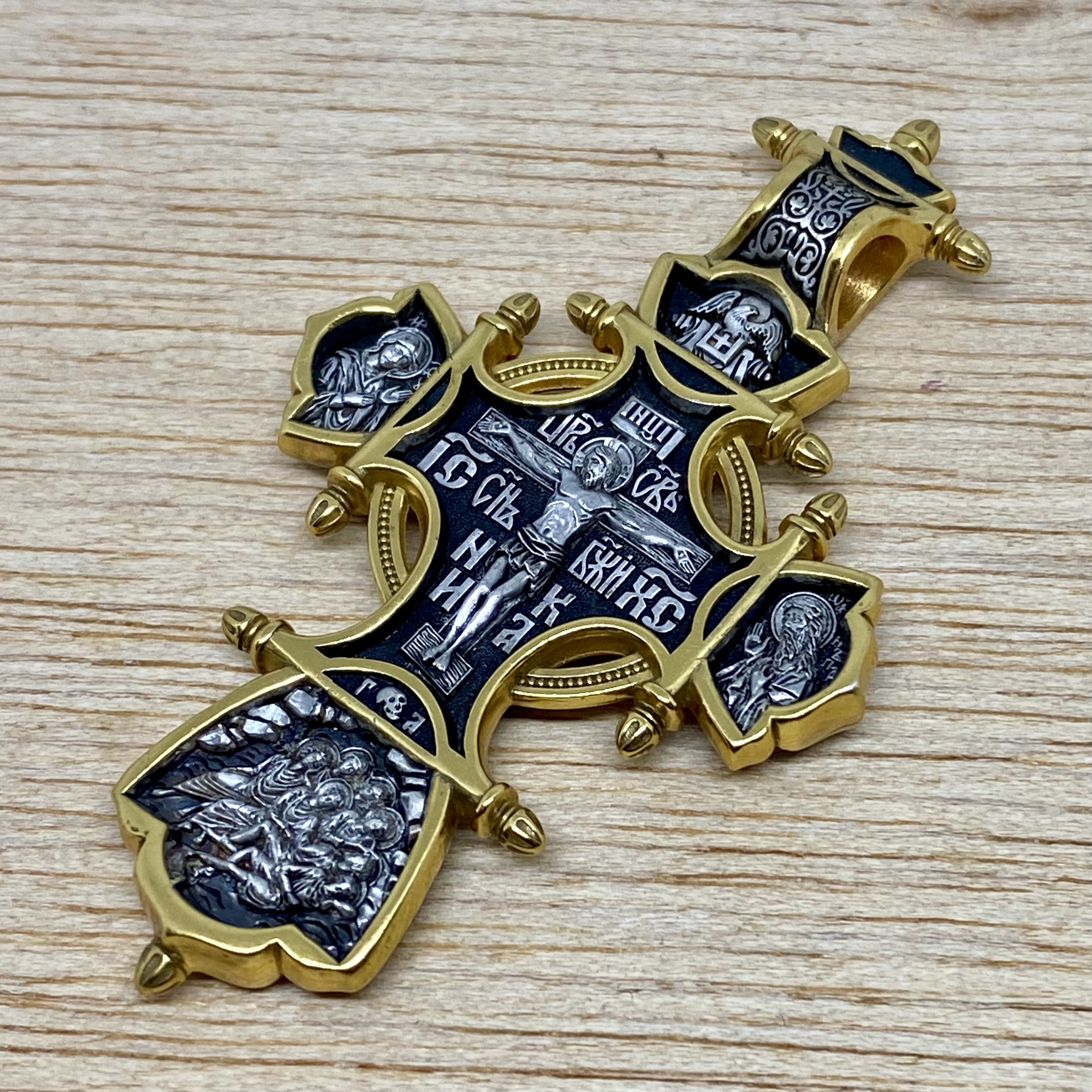 На лицевой стороне креста традиционно изображено Распятие Христово с предстоящими ему в деисусе (молении) Пресвятой Богородицей и пророком и Крестителем Иоанном Предтечей. Внизу – икона Семи отроков Эфесских. Это христианские мученики III века, которые были заживо замурованы в пещере и погрузились в чудесный сон, который длился два века.