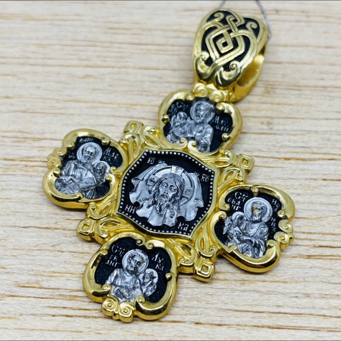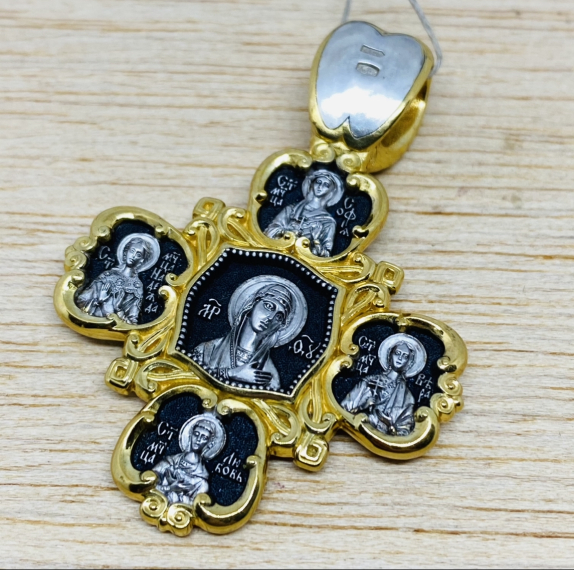 На лицевой стороне креста расположен Нерукотворный образ Господа Иисуса Христа, почитаемый как один из самых сильных защитных символов Православия. Этот образ Господь Сам отпечатлел на плате и послал больному проказой Эдесскому царю Авгарю для исцеления. В лепестках вокруг Спаса изображены евангелисты Матфей, Лука, Иоанн и Марк. На оборотной стороне помещен образ Божией матери "Невская Скоропослушница". В первую очередь перед иконой Божией Матери молятся о духовном прозрении. Само название «Скоропослушница», то есть «внимающая молитве скоро», — утешительно для просящего помощи человека. Через свою икону Богородица дарует помощь в излечении от различных заболеваний, в том числе онкологических. Перед Ее святым образом возносят молитву за детей и о помощи в родах - о рождении здорового ребенка. В лепестках вокруг Богородицы изображены образы мучениц Веры, Надежды и Любови, девочек 12- и, 10-ти и 9-ти лет, и матери их Софии. София благословила дочерей на мученичество во имя Христа. Похоронив дочерей, София умерла на их могиле от горя. Этим святым молятся за детей, благополучии в семье, ищут у них помощи в борьбе с искушениями.