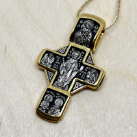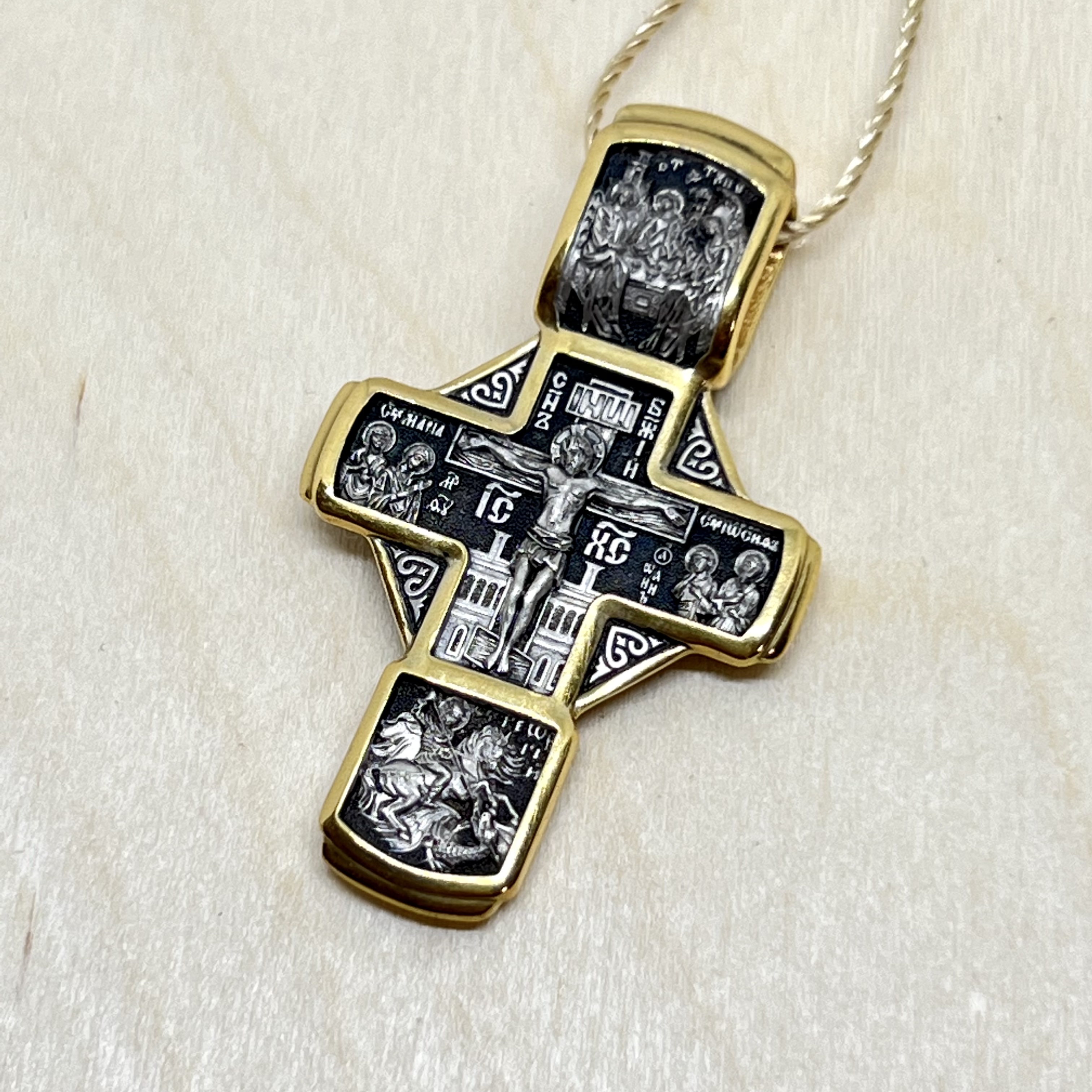 На кресте изображено Распятие Господа нашего Иисуса Христа. Ему предстоят св. Мария Магдалина, Пресвятая Богородица, апостол Иоанн и святой Иосиф, свидетели крестных страданий Господа. Вверху - икона Святой Троицы, на которой запечатлено явление Триединого Бога праотцу Аврааму в виде трех ангелов. В нижнем клейме изображено Чудо св. Георгия о змие. Великомученик Георгий почитается как покровитель воинов, защитник от злых сил, помощник в духовной борьбе. В центре на обороте - самый почитаемый в Православной Церкви святой, Николай Чудотворец. Ему молятся, отправляясь в путешествие, особенно по морю, просят исцеления в различных недугах, помощи в торговых делах, учебе и поисках достойного супруга. С двух сторон от Николая Чудотворца помещены образы архангелов Михаила и Гавриила. Вверху - икона Божией Матери Владимирская, главная святыня нашего Отечества. В нижнем клейме - иконы двух святых помощниц от всех недугов, блаженных Ксении Петербургской и Матроны
