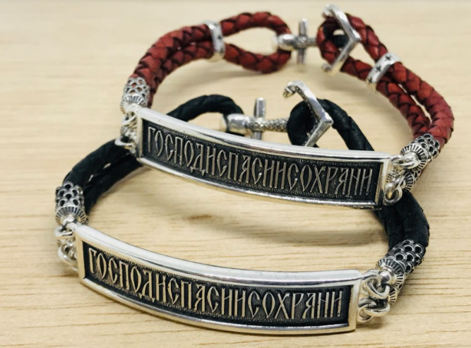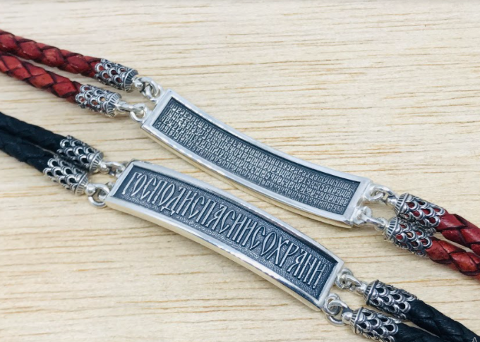 На серебряной пластине охранного браслета написаны две любимые верующими молитвы на церковно-славянском языке. На лицевой стороне помещена молитва «Господи, спаси и сохрани». Слова молитвы написаны полностью, без сокращений и титлования. Такое написание священных слов допускалось, если не возникало разницы в смыслах. Например, слово «Бог» могло быть написано только под титлом, потому что без титла оно обозначало языческого идола.