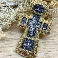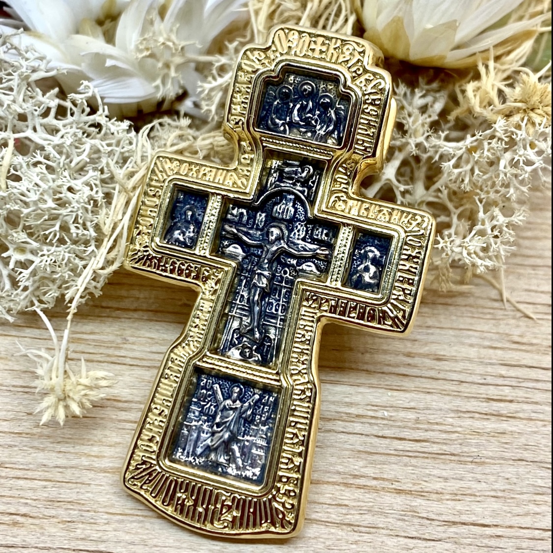 Большой мужской крест с двух сторон по борту обрамляют молитвы. На лицевой стороне — это молитва Кресту Христову, на обороте — Богородице. Такое символическое разделение, когда лицевая сторона посвящена Спасителю, а оборотная Его Пречистой Матери, — традиционно.