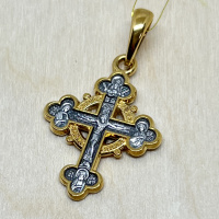 На лицевой стороне по традиции помещено Распятие Христов с предстоящими Кресту скорбными образами Пресвятой Богородицы и апостола Иоанна Богослова, любимого ученика Христа. А вверху благословляющий образ Бога Саваофа.