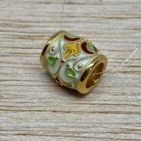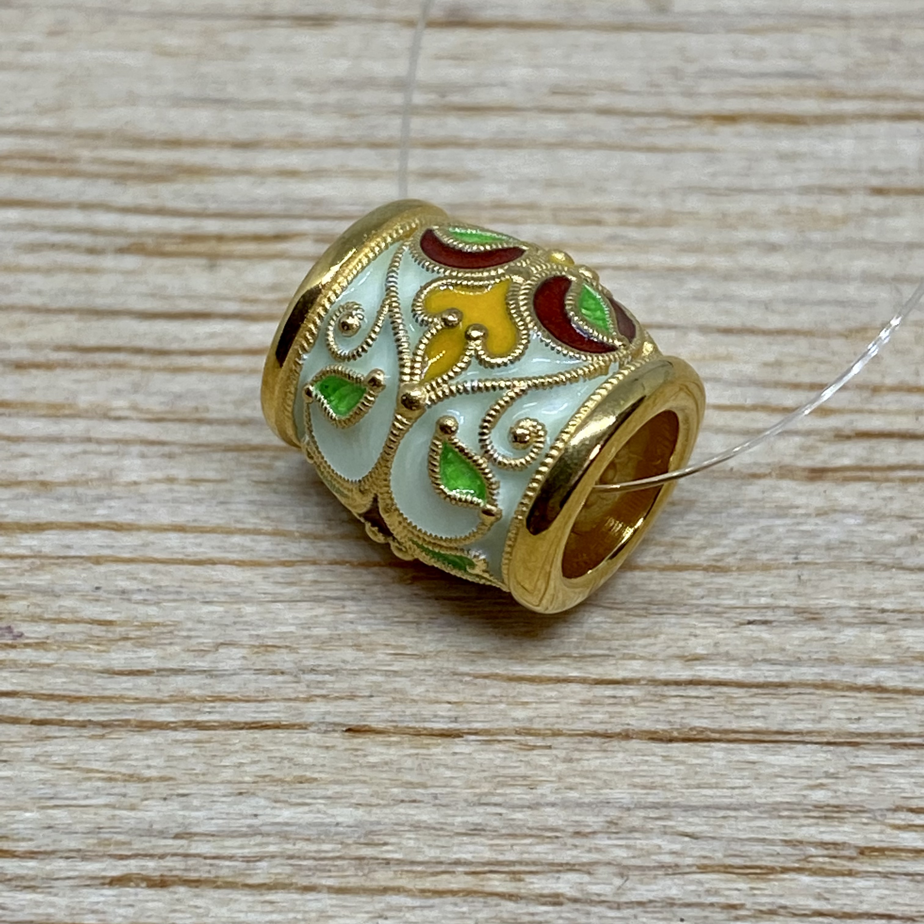 Рисунком своего традиционного орнамента эта бусина отсылает нас к царственным парчовым и шелковым нарядам. Парча, или алтабас представляет собой плотную шёлковую ткань с орнаментом из золотой волоченой или серебряной волоченой нити. Традиция носить наряды из шелковых вышитых тканей высокопоставленными особами и священнослужителями пришла к нам из Византии: с Востока же и привозили драгоценную ткань на Русь вплоть до XVII века.