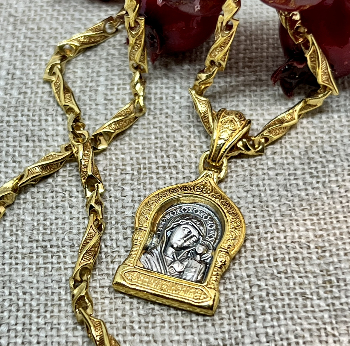 На образке изображена величайшая святыня, самая любимая и почитаемая верующими икона Пресвятой Богородицы — Казанская. Чудотворный образ помещен в рамку киотной формы, украшенную символическим орнаментом, называемым «процветшие сердца».