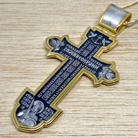 На лицевой стороне креста изображено Распятие Господа нашего Иисуса Христа. С двух сторон ему предстоят Пресвятая Богородица и св. пророк и Предтеча Господень Иоанн Креститель. Вверху помещена икона Святой Троицы. Это образ Триединого Бога, явившегося в виде трех ангелов праотцу Аврааму. На ухе изображён Нерукотворный образ Господа Иисуса Христа, почитаемый как один из самых сильных защитных символов Православия. Внизу – великомученик Георгий Победоносец, один из наиболее почитаемых святых христианской церкви, покровитель воинов, помощник в крестьянском труде, духовный помощник в невидимой брани с силами зла.
