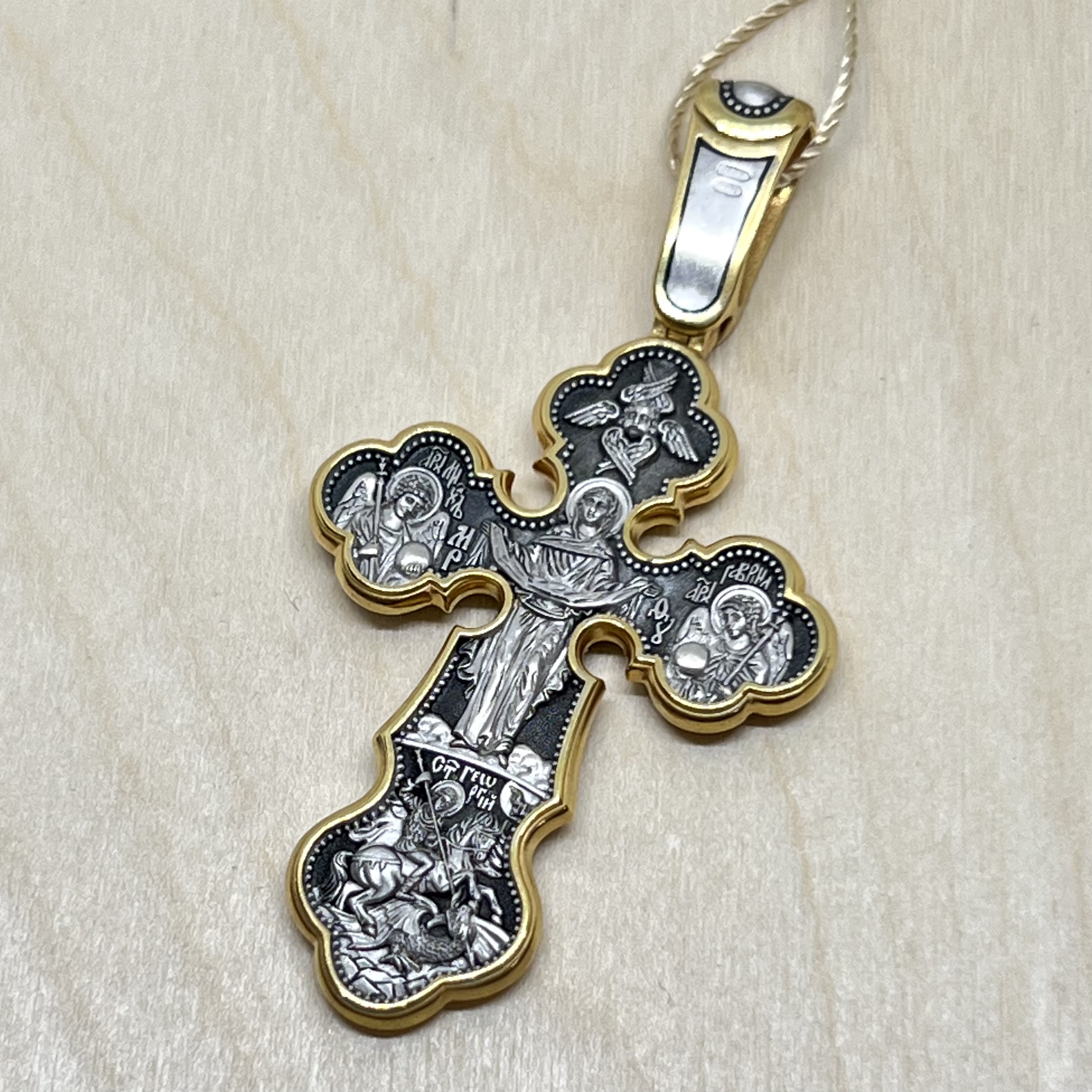 На кресте Богородица представлена в окружении высших ангелов: вверху — Серафим, справа и слева — архангелы Михаил и Гавриил.
