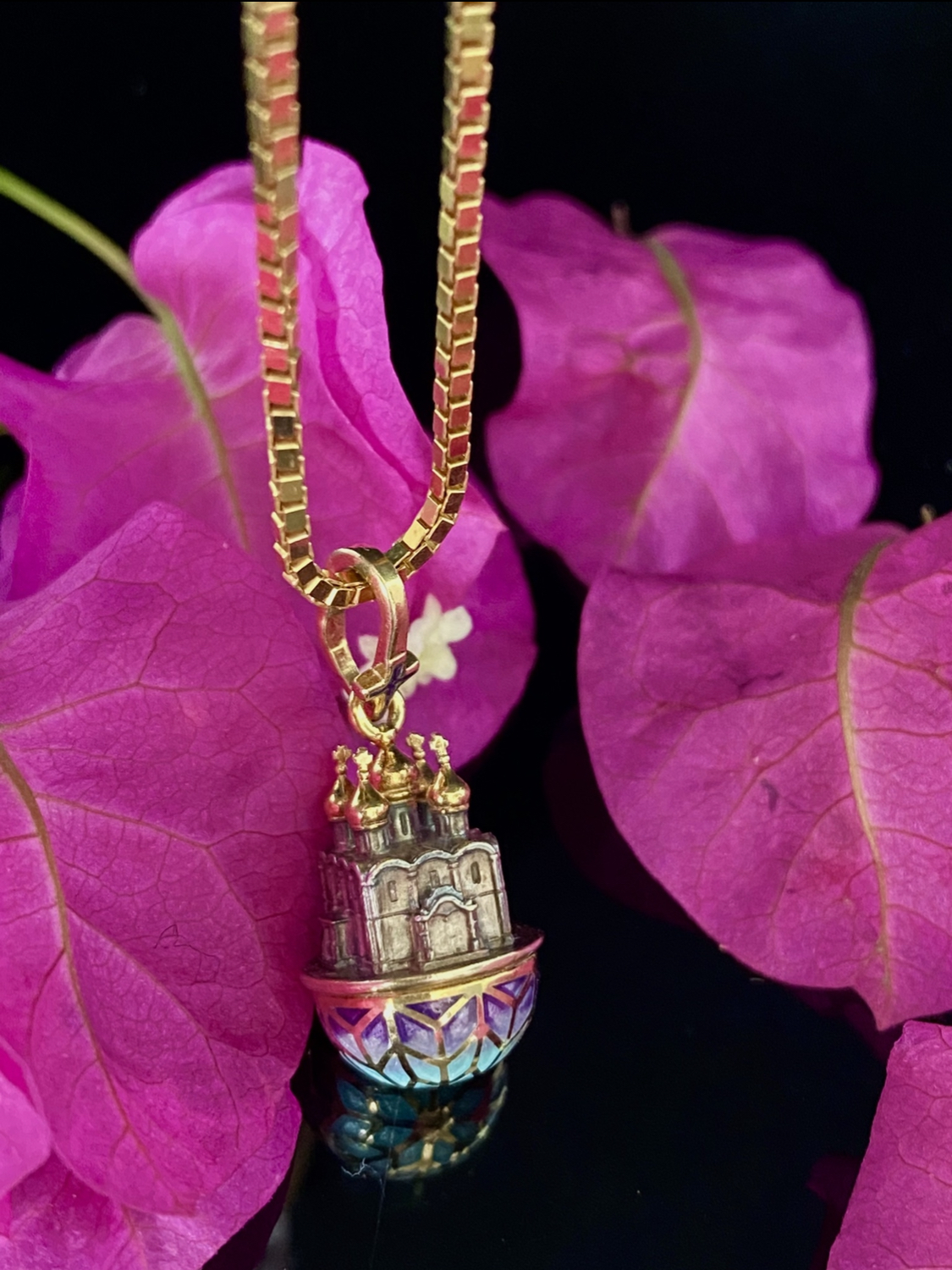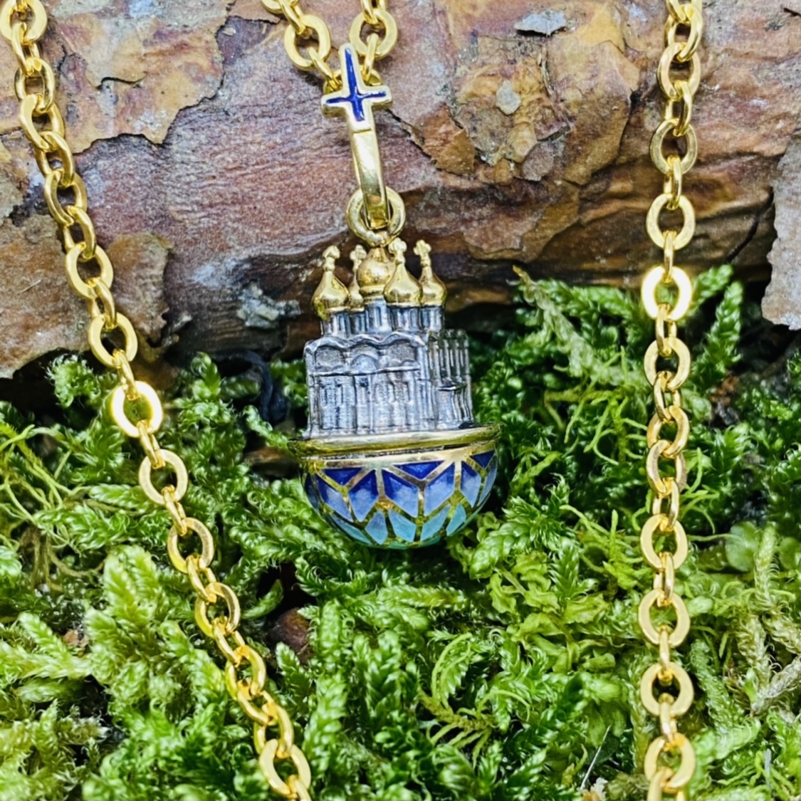 Верхняя часть подвески- воспроизведённый в серебре Величественный Пятикупольный Собор Успения Троице-Сергиевой Лавры. Возведён в честь Пресвятой Богородицы.