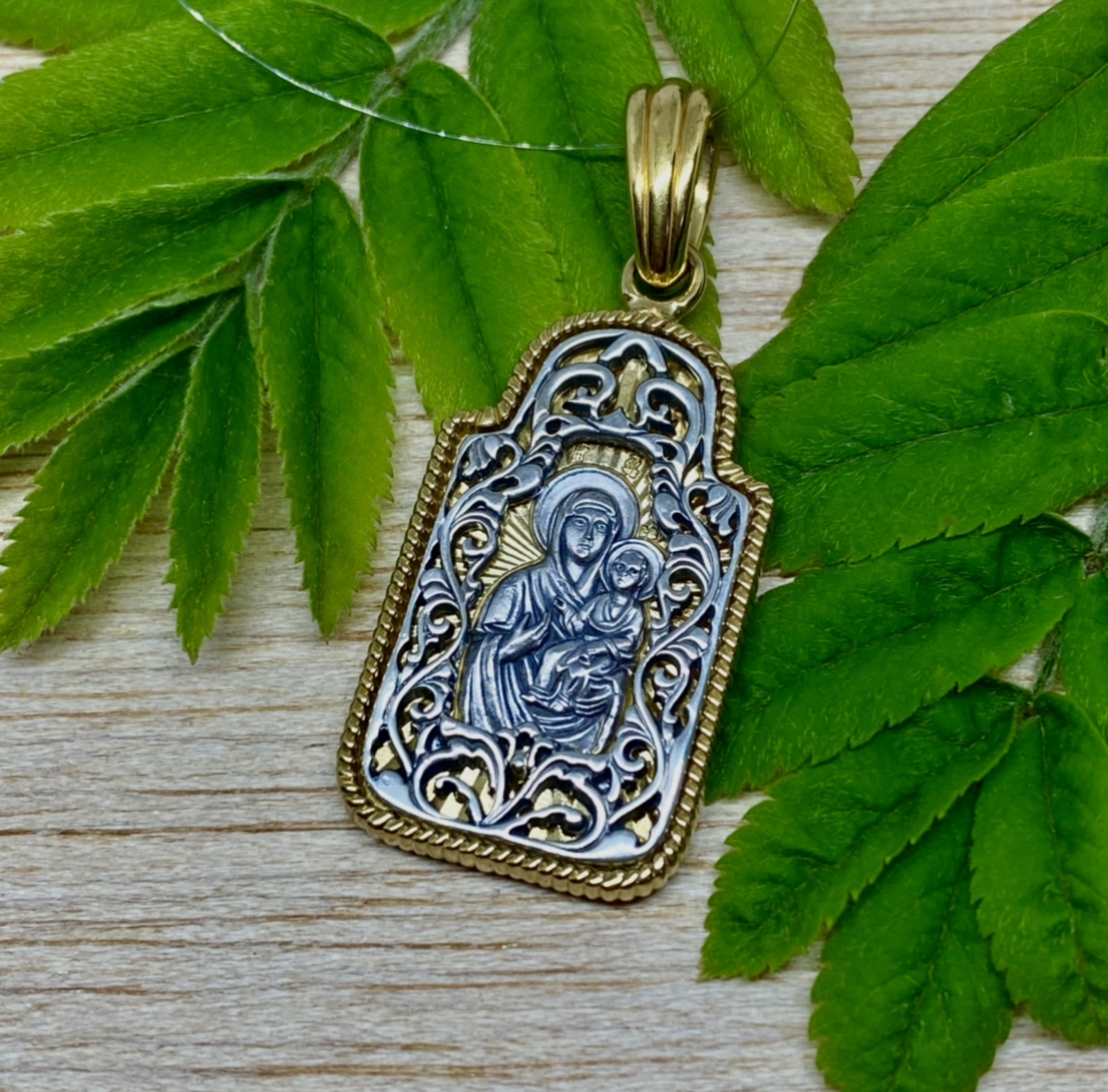Украшенная нарядным резным окладом Смоленская икона Божией Матери представлена на образке как бы осененная лучами Божественной Славы.