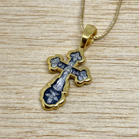 На лицевой стороне креста изображено Распятие Господа Иисуса Христа, на обороте — Валаамская икона Пресвятой Богородицы. Икона была написана в 1878 году иеромонахом Валаамского монастыря о. Алипием и прославилась чудом исцеления мещанки Натальи Андреевой в 1897 году и с тех пор почитается как целительница при различных недугах. Это одна из главных святынь Валаамского монастыря, великая чудотворная икона России, которая находится сейчас в монастыре «Новый Валаам» в Финляндии.