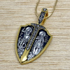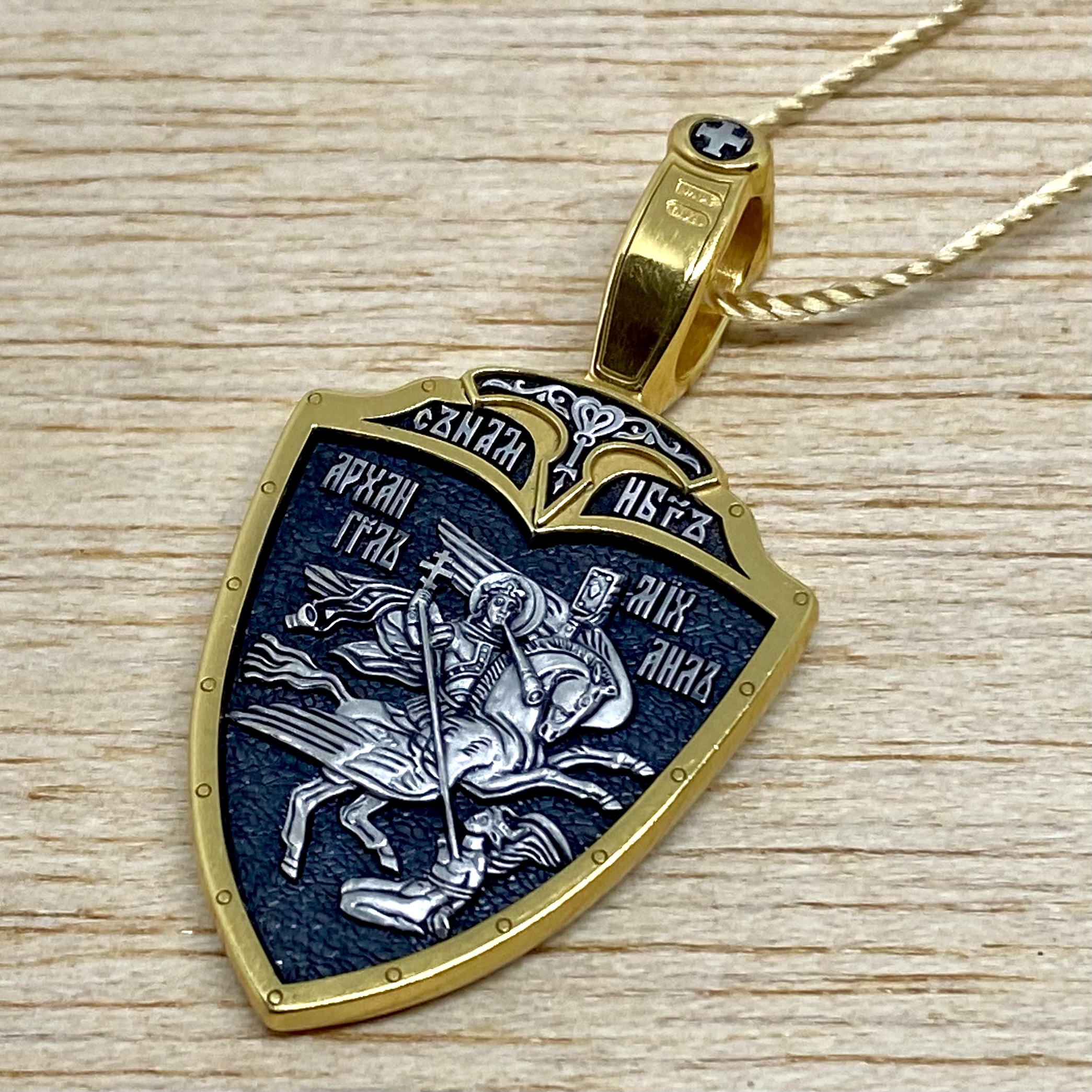 На лицевой стороне подвески изображены святые Александр Невский и Георгий Победоносец. Святой Александр Невский почитается как защитник православных христиан и покровитель воинов. Мощи святого покоятся в Александро-Невской Лавре в Петербурге. Георгий Победоносец является помощником в крестьянском труде, защитником в бедах, духовной помощью в невидимой брани с силами зла. На обороте изображён Архангел Михаил летящий на красном крылатом коне. Это образ Архангела — защитника молящегося от видимых и невидимых врагов как в земной жизни, так и после смерти.