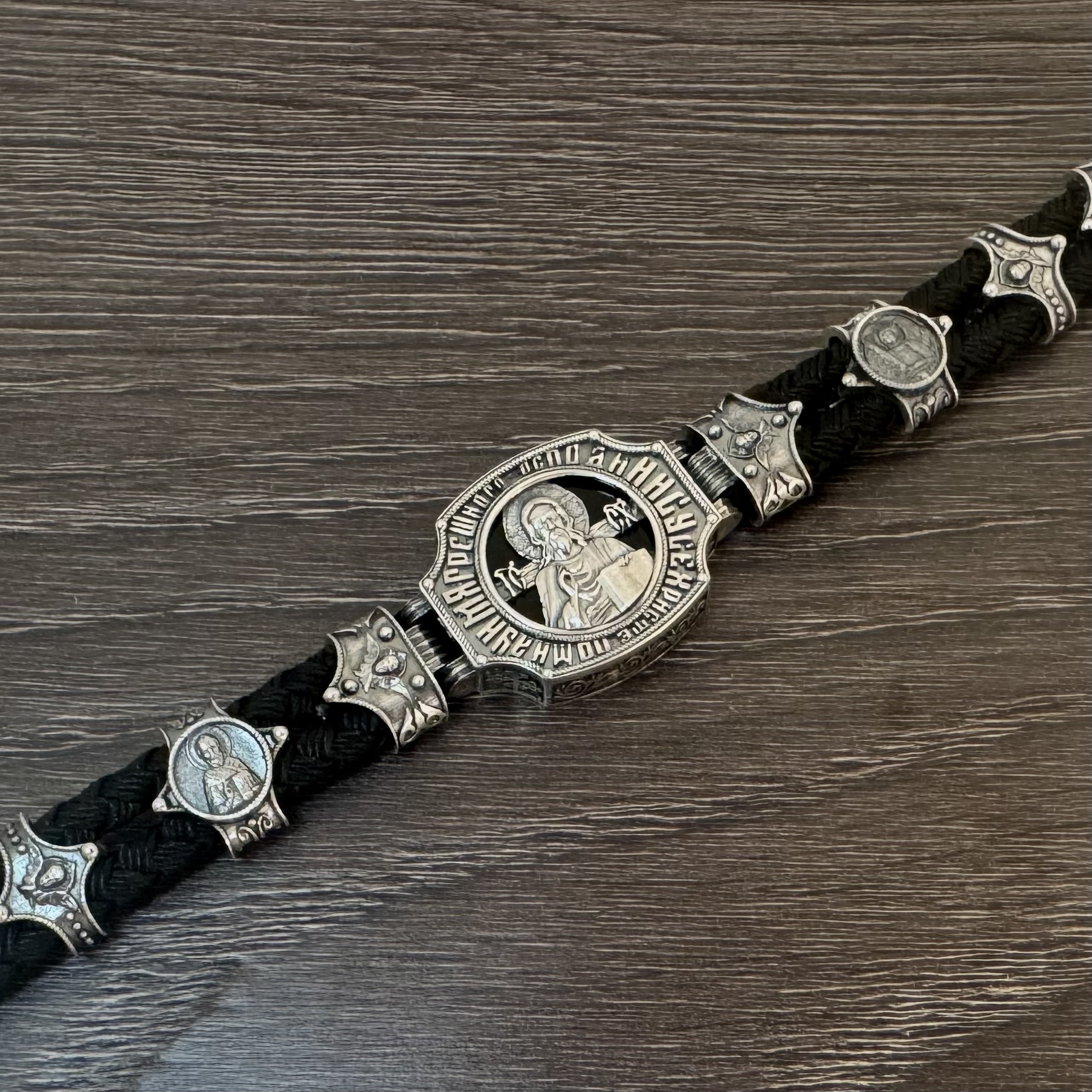 На лицевой стороне браслета изображен Нерукотворный образ Господа Иисуса Христа, почитаемый как один из самых сильных защитных символов Православия. На дополнительных пластинах изображены Николай Чудотворец и Архангел Михаил.