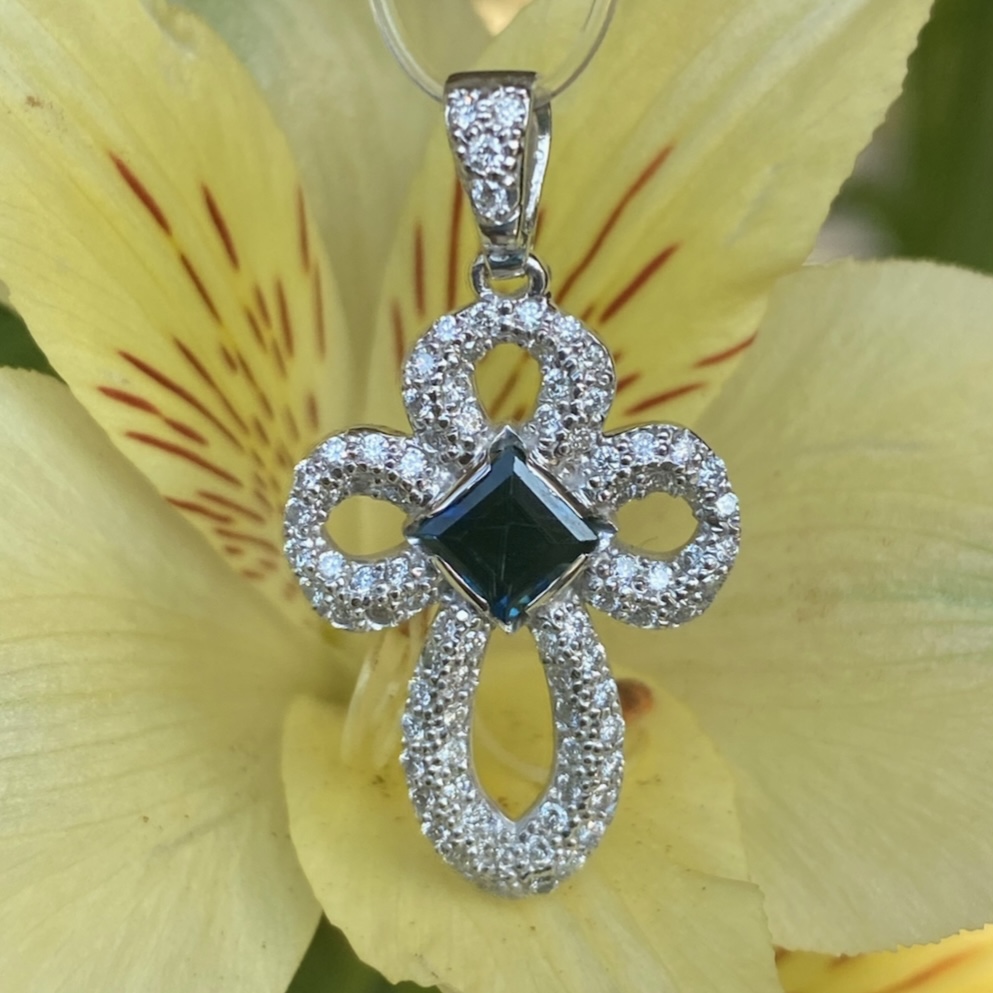 В центре крестика расположен натуральный синий сапфир, огранки «Принцесса»- 0.8 кт