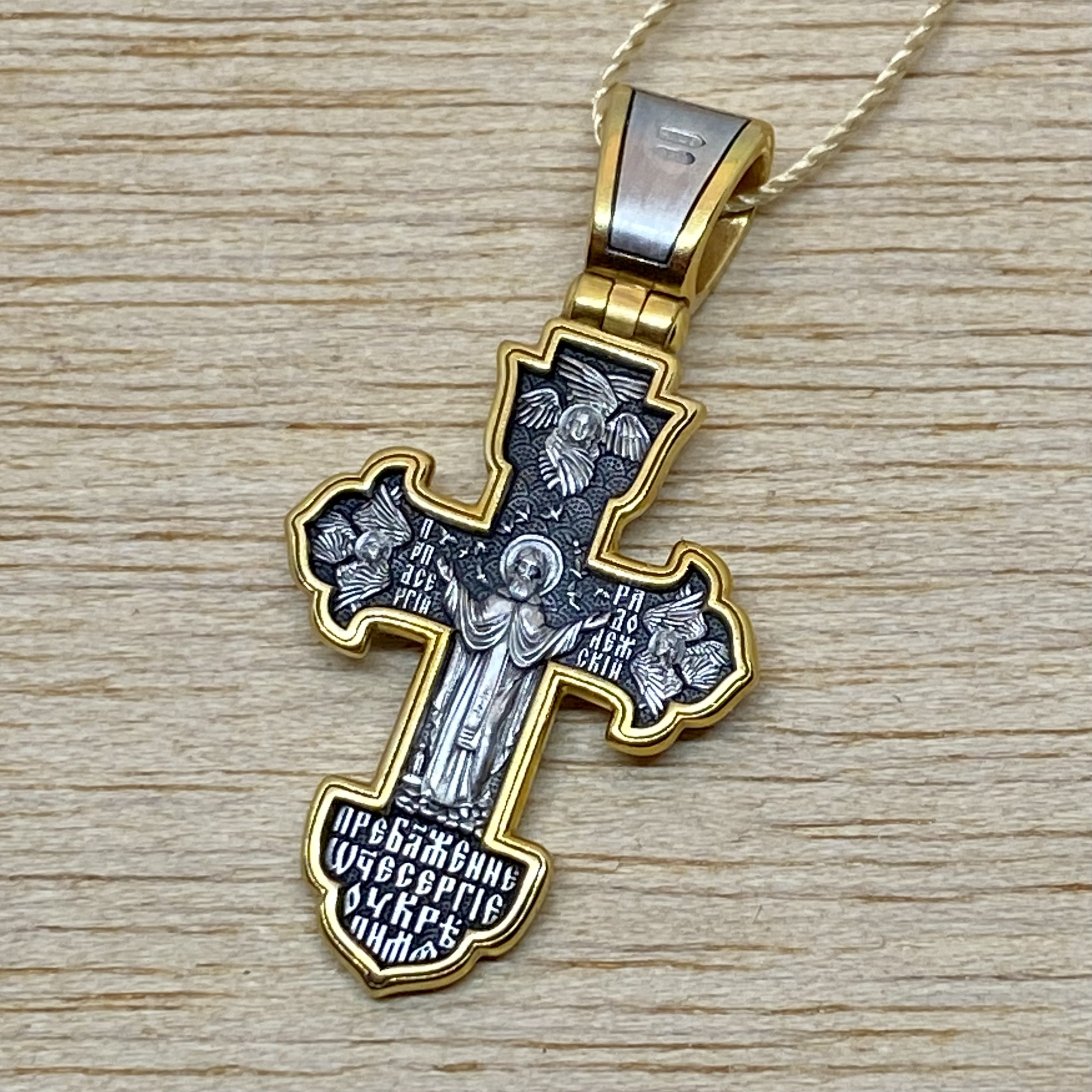 На лицевой стороне креста изображено Распятие Господа Иисуса Христа. На обороте помещена икона прп. Сергия Радонежского, великого чудотворца Русской земли, почитающегося как целителя, помощника в бедственных обстоятельствах, покровителя воинов и учащихся.Вокруг образа святого написаны слова песнопения Животворящему Кресту: