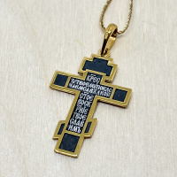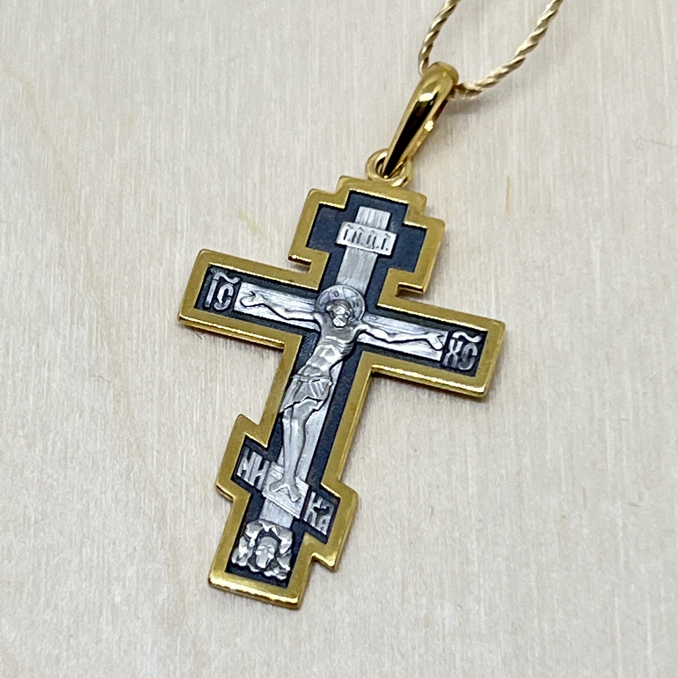 На лицевой стороне креста изображено Распятие Господа Иисуса Христа На обороте написан тропарь Животворящему Кресту: «Кресту Твоему поклоняемся, Владыко, и святое воскресение Твое славим».