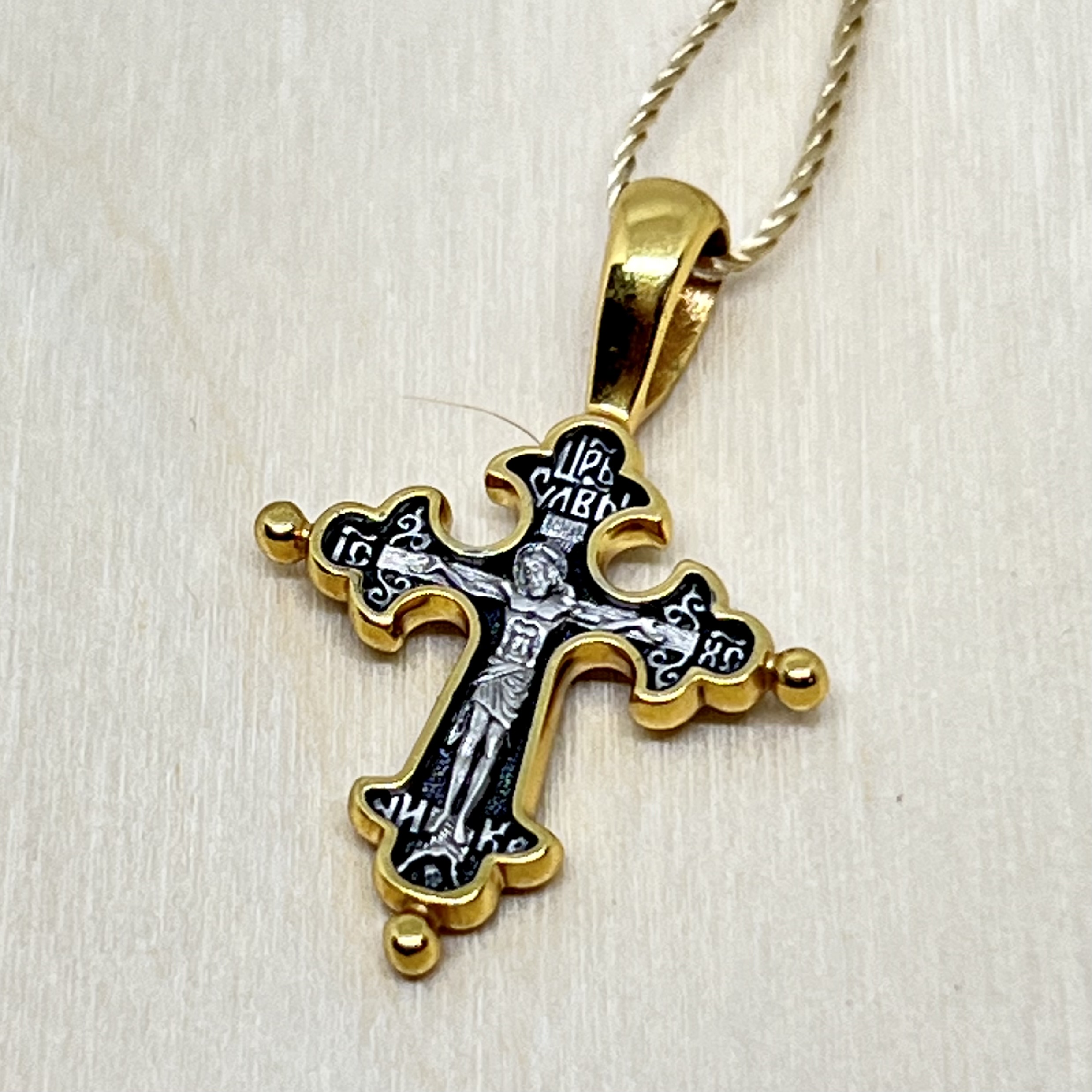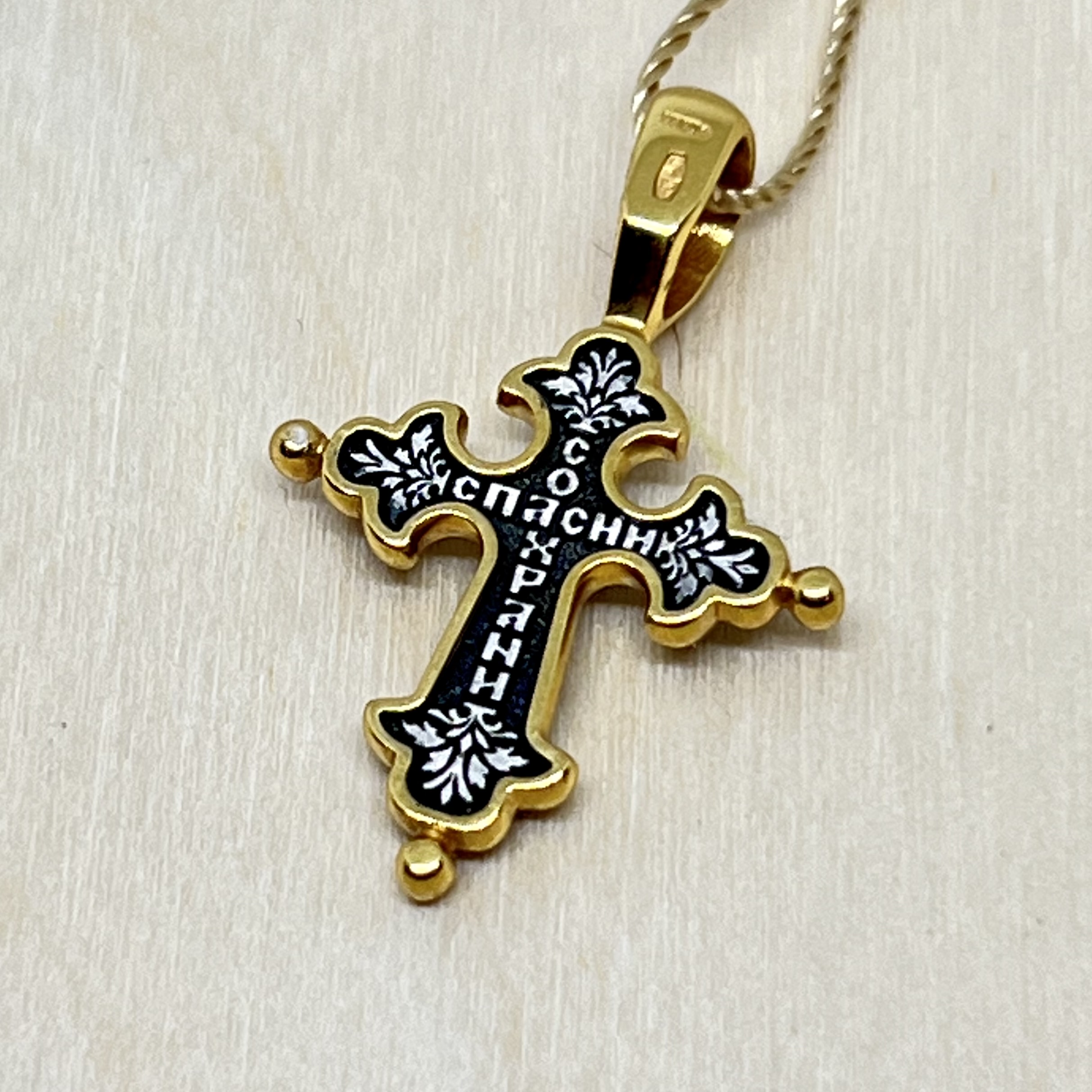 На обороте — короткая молитва, обращенная к Господу, которая традиционно помещается на нательных крестах: «Спаси и сохрани».