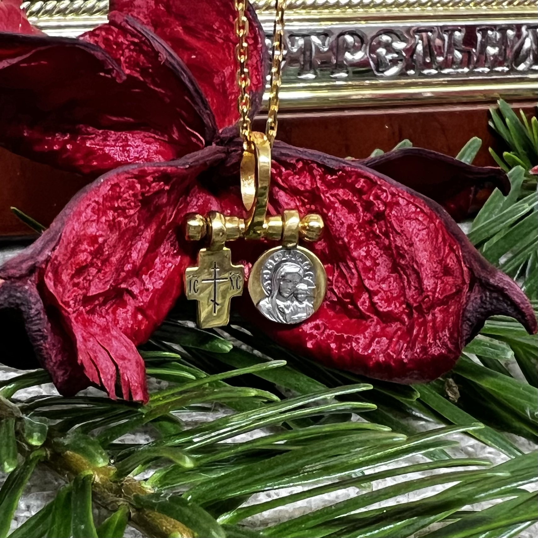 Это изделие сочетает в себе образ Богородицы и изображение восьмиконечного креста.