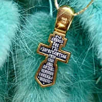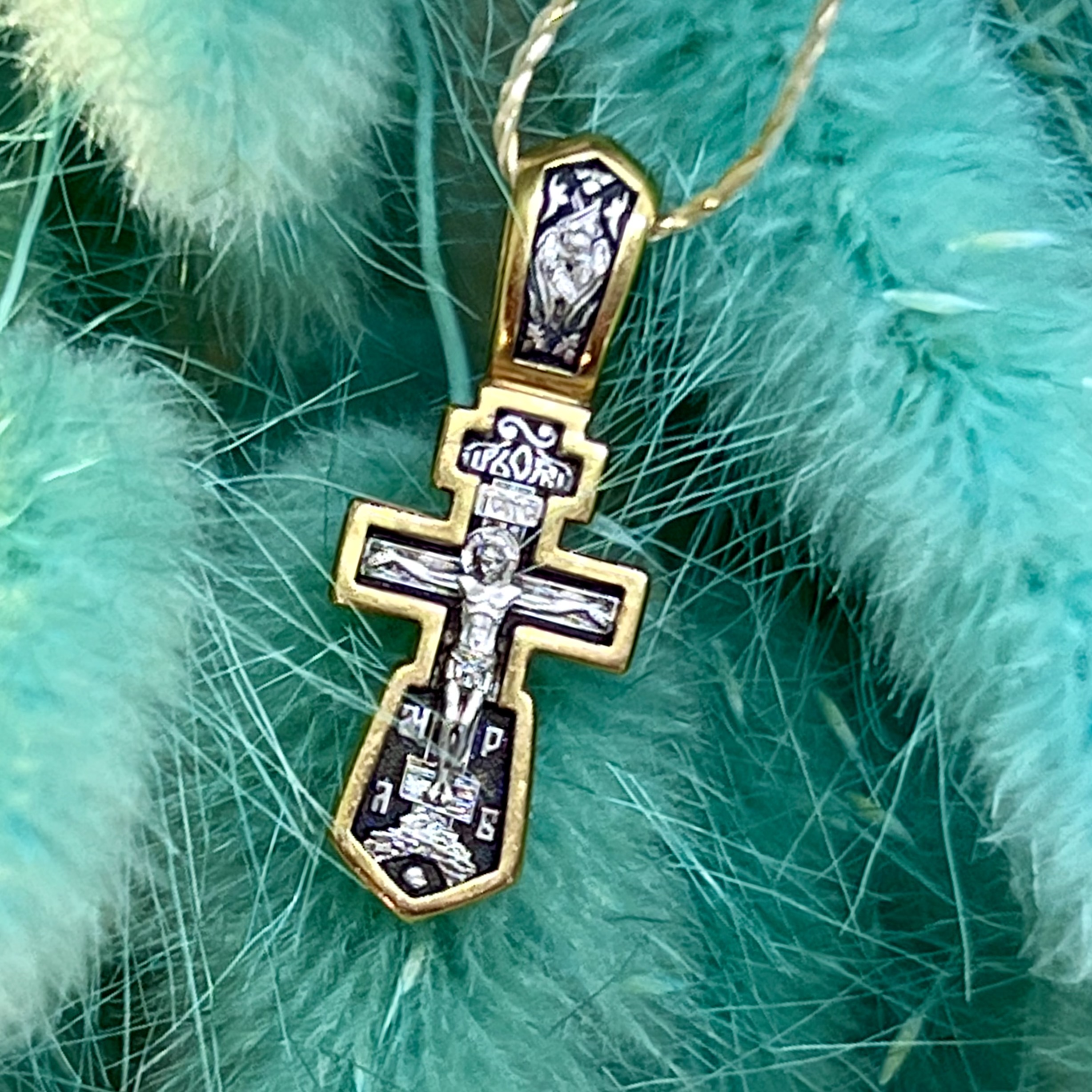 На лицевой стороне креста изображено Распятие Господа нашего Иисуса Христа. На ухе изображен серафим — шестикрылый огненный ангел. На обороте написаны начальные стихи оградительной молитвы Честному Кресту Господню.