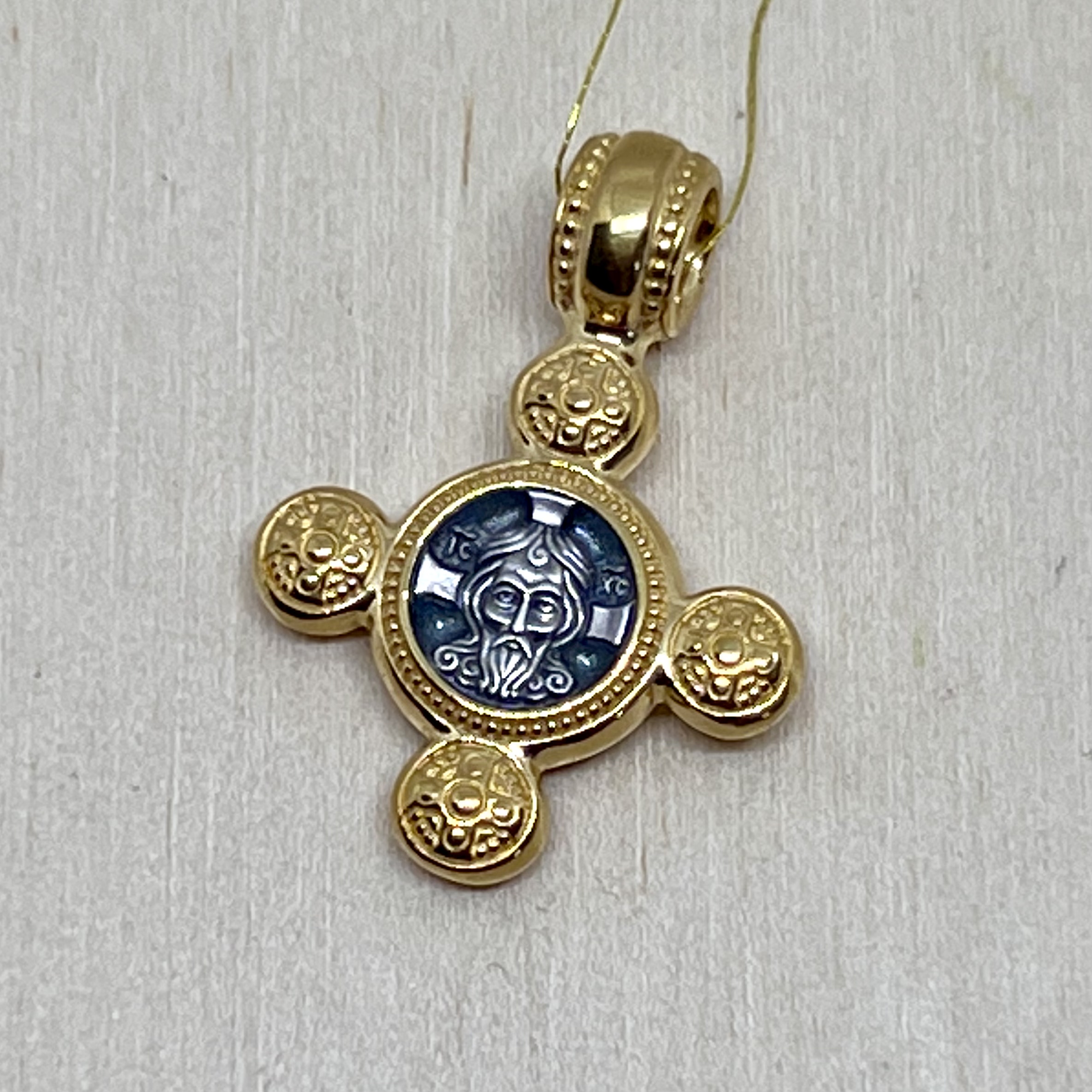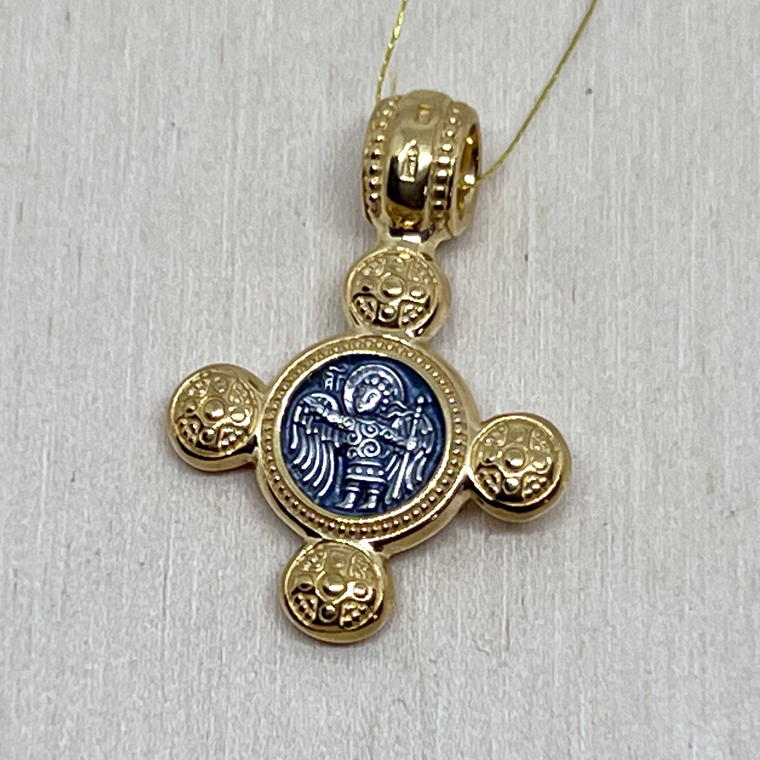 Небольшой нательный крест с Образом Спаса Нерукотворного на лицевой стороне и иконой Ангела Хранителя на обороте создан в традициях Православной Церкви с использованием древнехристианской символики.