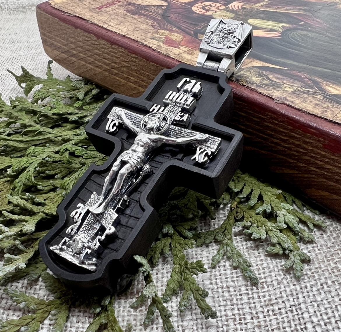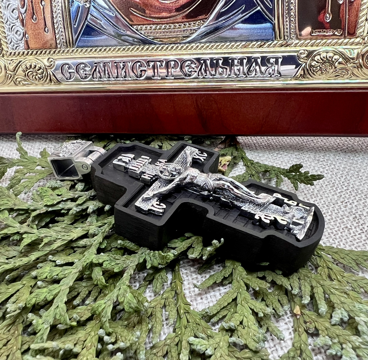 На обороте — короткая молитва, которая традиционно помещается на нательных крестах: «Спаси и сохрани».