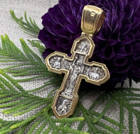 На лицевой стороне изображено Распятие Господа Иисуса Христа. С двух сторон Христу предстоят Пресвятая Богородица и Иоанн Креститель, главные молитвенники за людей перед Богом. Такая композиция называется «Деисус», что значит «моление». Внизу –икона Архангела Михаила, могучего защитника от злых сил. На обороте в центре – Ангел-Хранитель, рядом с которым помещены образы особо почитаемых в Церкви святых, мощи. Это св. блаженная Ксения Петербургская, св. блгв. кн. Александр Невский, и великий святой целитель и чудотворец прп. Александр Свирский. Вверху креста – Казанская икона Пресвятой Богородицы.