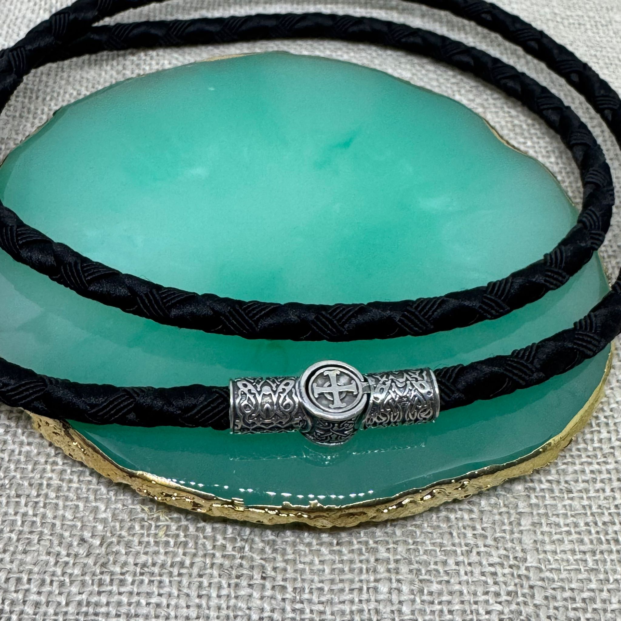 Концевики шнурка украшают византийский орнамент и «Греческий крест» по центру.