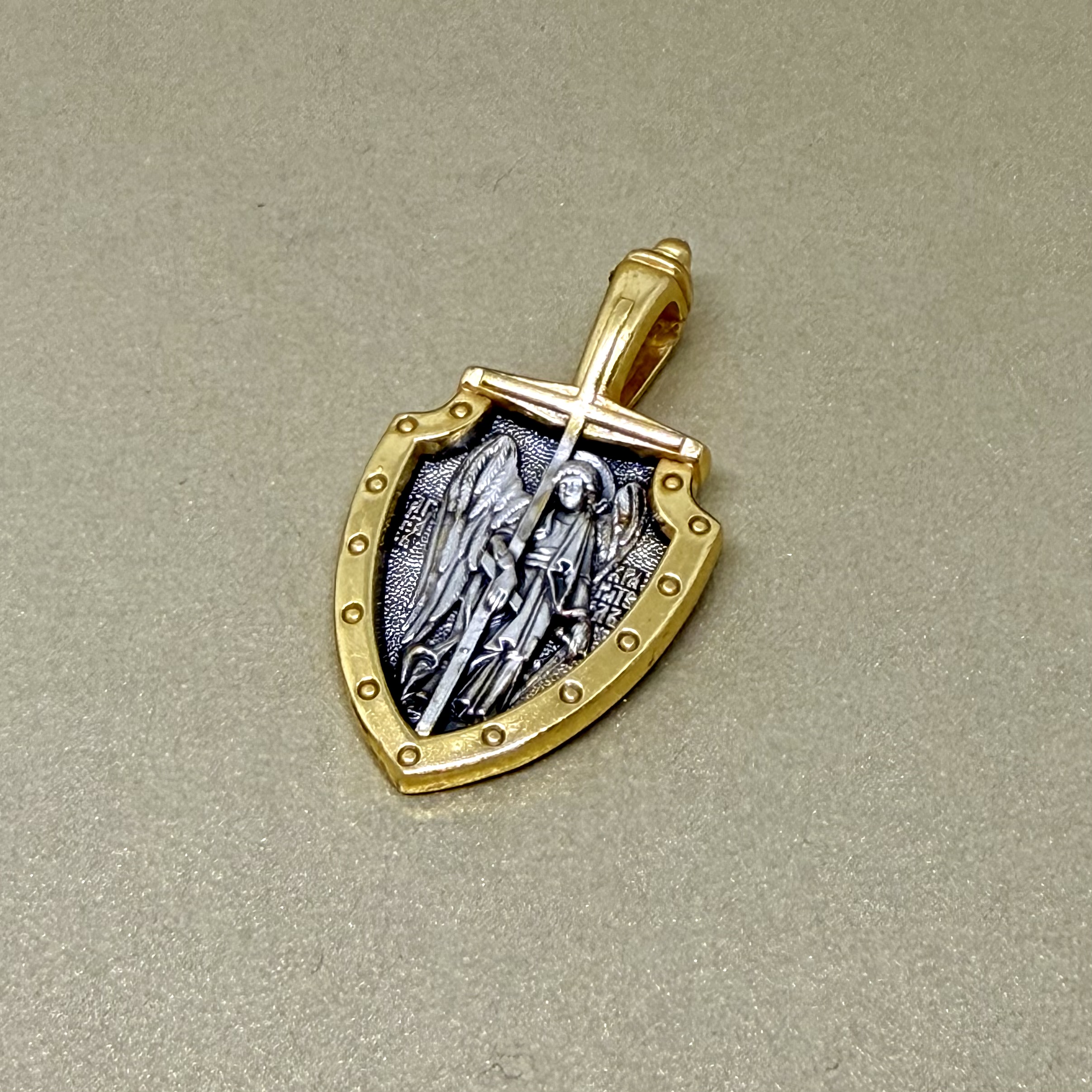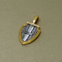 На образке, выполненном в форме щита, изображен Ангел Хранитель. В руках он держит традиционные символические атрибуты: крест — знак послушания Христу и следования Его заповедям, меч — символ непримиримой борьбы, которую он ведет с бесами, отражая их нападения на людей.