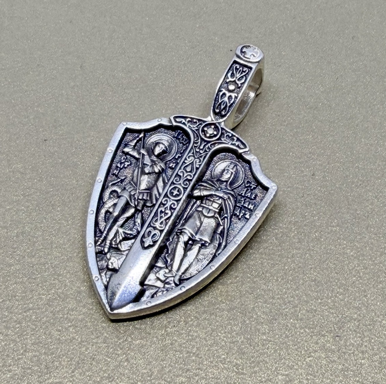 На лицевой стороне подвески изображены святые Александр Невский и Георгий Победоносец. Святой Александр Невский почитается как защитник православных христиан и покровитель воинов. Мощи святого покоятся в Александро-Невской Лавре в Петербурге. Георгий Победоносец является помощником в крестьянском труде, защитником в бедах, духовной помощью в невидимой брани с силами зла. На обороте изображён Архангел Михаил летящий на красном крылатом коне. Это образ Архангела — защитника молящегося от видимых и невидимых врагов как в земной жизни, так и после смерти.